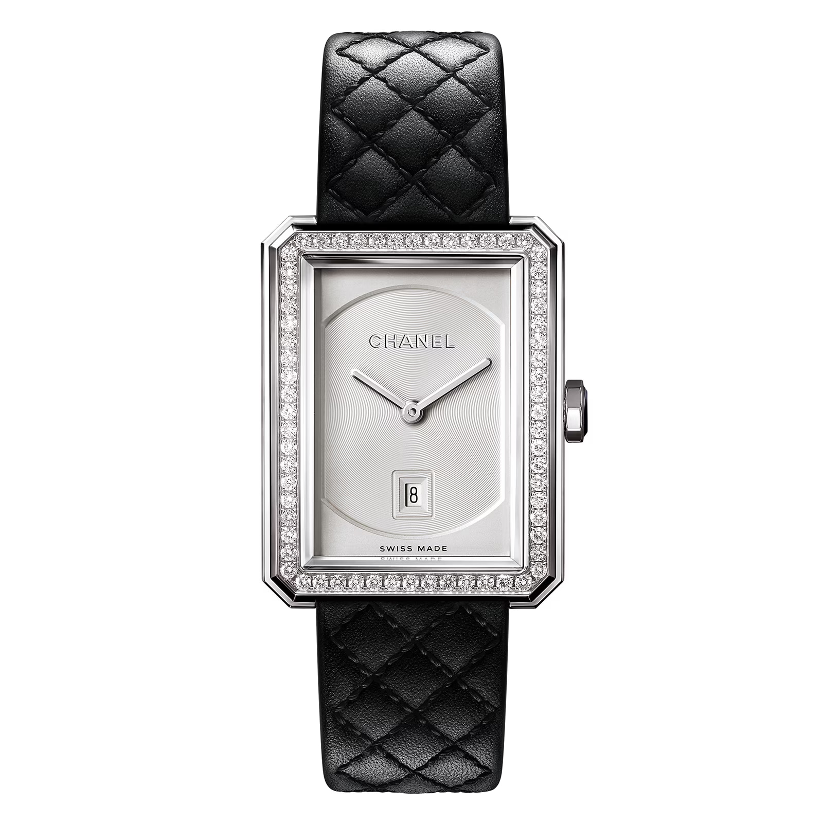 The Chanel designers are famous throughout the world for their innovative fashion pieces and their watches are no exception. With master watchmakers and designs that reflect current trends, the end result is a collection of stunning timepieces. Pure lines, balanced proportions, perfected shapes: The BOY·FRIEND watch is an alluring blend of boldness and restraint. Radically elegant, it dares to challenge established codes, erasing the lines between masculine and feminine style. Featuring a medium version Boy-Friend watch, with steel case and steel bezel set with 64 brilliant-cut diamonds, and day date indicator. On a black quilted pattern calfskin strap with interchangeable system and ardillon buckle, and second strap included. With a high precision quartz movement and water resistant to 30m.
