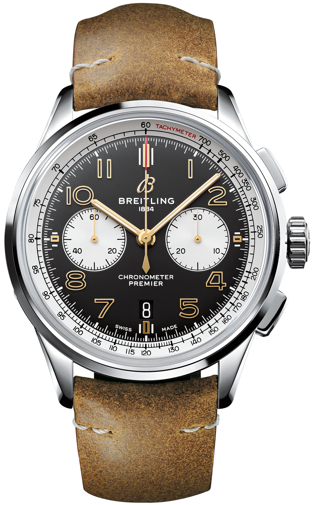 Breitling Premier B01 Chronograph 42 Norton Edition. AB0118A21B1X1 Designed in partnership with British motorcycle manufacturer Norton, Breitling have released this stunning Breitling Premier B01 Chronograph 42 Norton Edition watch to celebrate the innovative and adventurous streak found in both brands. Alongside this special edition Breitling watch, Norton have engineered and released a Norton Commando 961 Caf̩ Racer MKII Breitling Limited Edition motorbike, a powerful machine that is a worthy counterpart to its COSC certified timepiece. The Breitling Premier B01 Chronograph 42 Norton Edition watch has a fine engine of its own; the Breitling Manufacture Caliber 01 is chronometer certified to be accurate to -4 to +6 seconds a day and boasts an unbeatable power reserve of 70 hours. The special edition watch is full of Norton inspired tropes including the Norton logo decorated on a plate on the left side of the case and on the transparent sapphire crystal case back. Through the back you can admire the workings of the self-winding calibre as it powers the hour, minute, central chronograph seconds, 30 minutes counter, 12 hours counter and date functions. The case of this Breitling Premier Norton Special Edition watch measures to 41mm in size and comes crafted from polished stainless steel that is water resistance to 100 metres. The black dial is beautifully detailed with subtle gold tones which add a striking vintage touch to the piece while the distressed brown calfskin leather strap add a final dynamic and comfortable finish.