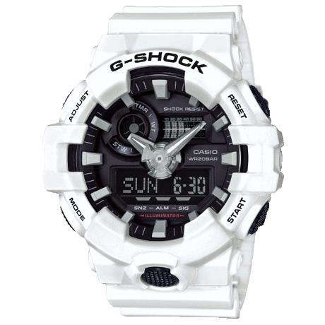 The Watch: Casio G-Shock Black White Men’s Alarm Chronograph GA-700-7AERThis Casio G-Shock Black Red Men’s Alarm Chronograph (GA-700-7AER) features a powerful and bold 3D face, with this robust styling being added to by the carved-metal-effect hands and centrally positioned function button. Key Features:Countdown TimerHand Moving FunctionStopwatchWorld Time FunctionAuto Calendar12 & 24 Hour TimekeepingLED-Backlit DisplayWater Resistant to 200m The Family: G-ShockAt a time when watches were seen as fragile, delicate instruments, Casio’s head of watch design, Kikuo Ibe, set out in 1981 to create “a watch that doesn’t break, even when dropped.” After 200 prototypes and two years of development, the Casio G-Shock was launched in 1983. Gaining its now legendary toughness from Ibe’s revolutionary decision to suspend the module inside a hollow rubber structure, the G-Shock has been the go-to name in superbly durable and precise wristwear ever since. The Brand: CasioCasio was established in 1946 by Japanese engineer Tadao Kashio. The company entered the timepiece market in 1974 with the release of the Casiotron, the world’s first Auto Calendar watch. Only eleven years after entering this field, Casio completely reshaped global thought about the function a watch should perform with the release of the pioneering and now legendary G-Shock family. Innovation and world firsts have defined the company’s history ever since, the most striking of these being the release of the first ever touch screen watch in 1991, 24 years before the Apple Watch, and the first ever wrist camera watch in 2000. In short, Casio was producing smartwatches decades before the term had even been coined. Add to this the hipster popularity of the company’s retro designs, and Casio has firmly cemented its reputation as a famously reliable and precise name in both analogue and digital watches. Who We AreWatchNation is proud to be an authorized, established and respected supplier of Casio watches. We stock a broad and exciting range of these superb timepieces both online and in store. Visiting us in store, located at 15-17 Charles Street, Hoole, Chester, CH2 3AZ, gives you the opportunity to take a first-hand look at our fantastic range of high-quality timepieces, with our friendly team of staff always on hand to use their decades of experience to offer helpful advice, useful information and expert guidance. If you can’t pay a visit to our store, then our online delivery service guarantees that your latest timepiece will go from checkout to your wrist in a fast and reliable manner. These services are all a product of the motto on which WatchNation was founded and will forever operate – “Time for the People.”