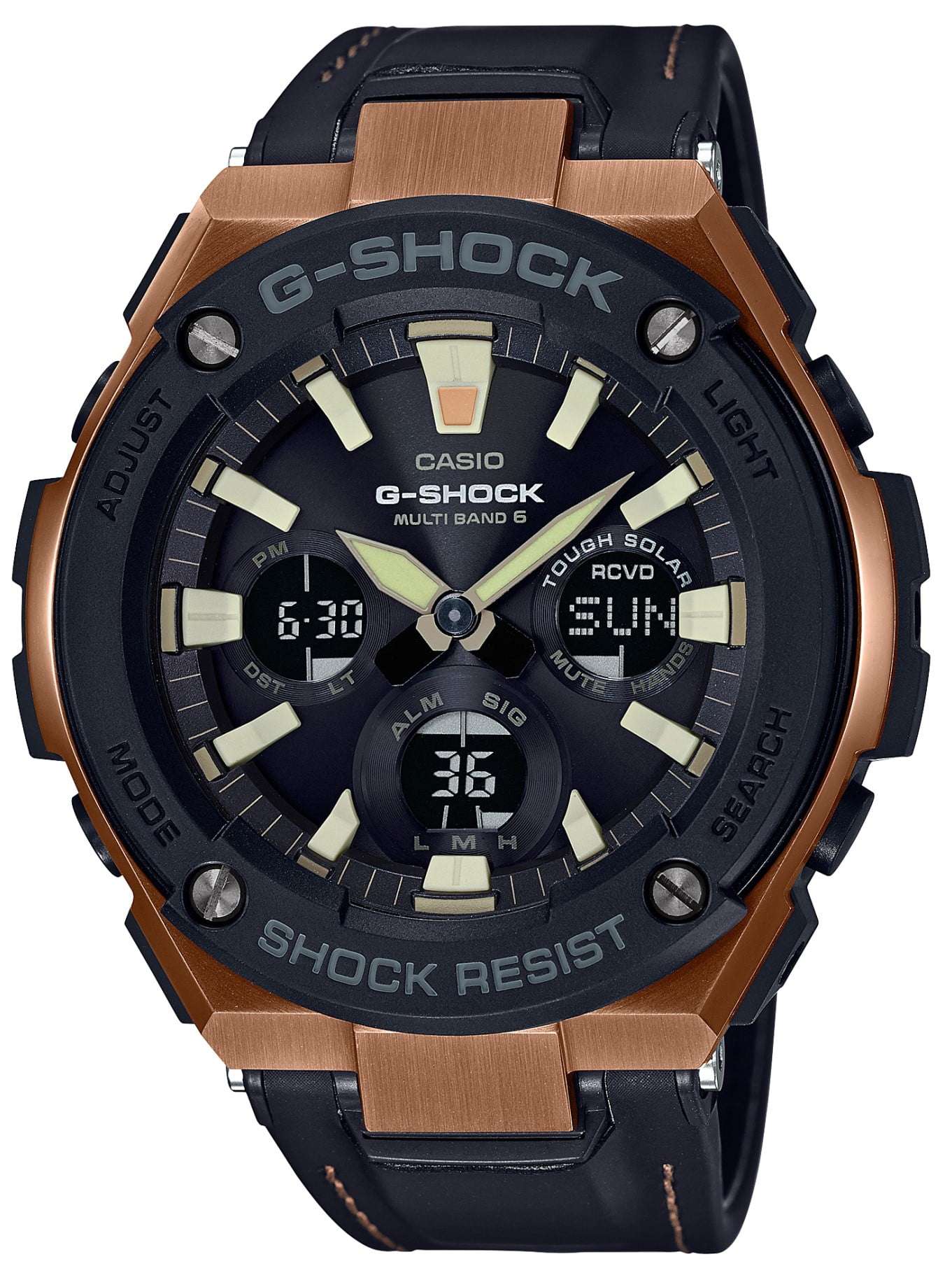 The Watch: Casio G-Steel Black Leather Strap Men’s Alarm Chronograph GST-W120L-1AERThis Casio G-Steel Black Leather Strap Men’s Alarm Chronograph (GST-W120L-1AER) teams the G-Steel series’ trademark layered toughness with sleek and urban styling, as a black Tough Leather strap is teamed with a striking rose gold tone case. Key Features:Tough Leather Strap with Urethane InsertWorld Time FunctionBattery Level IndicatorAuto CalendarHand Moving FunctionAuto-Illuminator DialThe Ability to Set 5 Daily Alarms12 & 24 Hour TimekeepingSolar PoweredStopwatchCoutdown TimerHourly Time SignalsWater Resistant to 200m The Family: G-ShockAt a time when watches were seen as fragile, delicate instruments, Casio’s head of watch design, Kikuo Ibe, set out in 1981 to create “a watch that doesn’t break, even when dropped.” After 200 prototypes and two years of development, the Casio G-Shock was launched in 1983. Gaining its now legendary toughness from Ibe’s revolutionary decision to suspend the module inside a hollow rubber structure, the G-Shock has been the go-to name in superbly durable and precise wristwear ever since. The Brand: CasioCasio was established in 1946 by Japanese engineer Tadao Kashio. The company entered the timepiece market in 1974 with the release of the Casiotron, the world’s first Auto Calendar watch. Only eleven years after entering this field, Casio completely reshaped global thought about the function a watch should perform with the release of the pioneering and now legendary G-Shock family. Innovation and world firsts have defined the company’s history ever since, the most striking of these being the release of the first ever touch screen watch in 1991, 24 years before the Apple Watch, and the first ever wrist camera watch in 2000. In short, Casio was producing smartwatches decades before the term had even been coined. Add to this the hipster popularity of the company’s retro designs, and Casio has firmly cemented its reputation as a famously reliable and precise name in both analogue and digital watches.