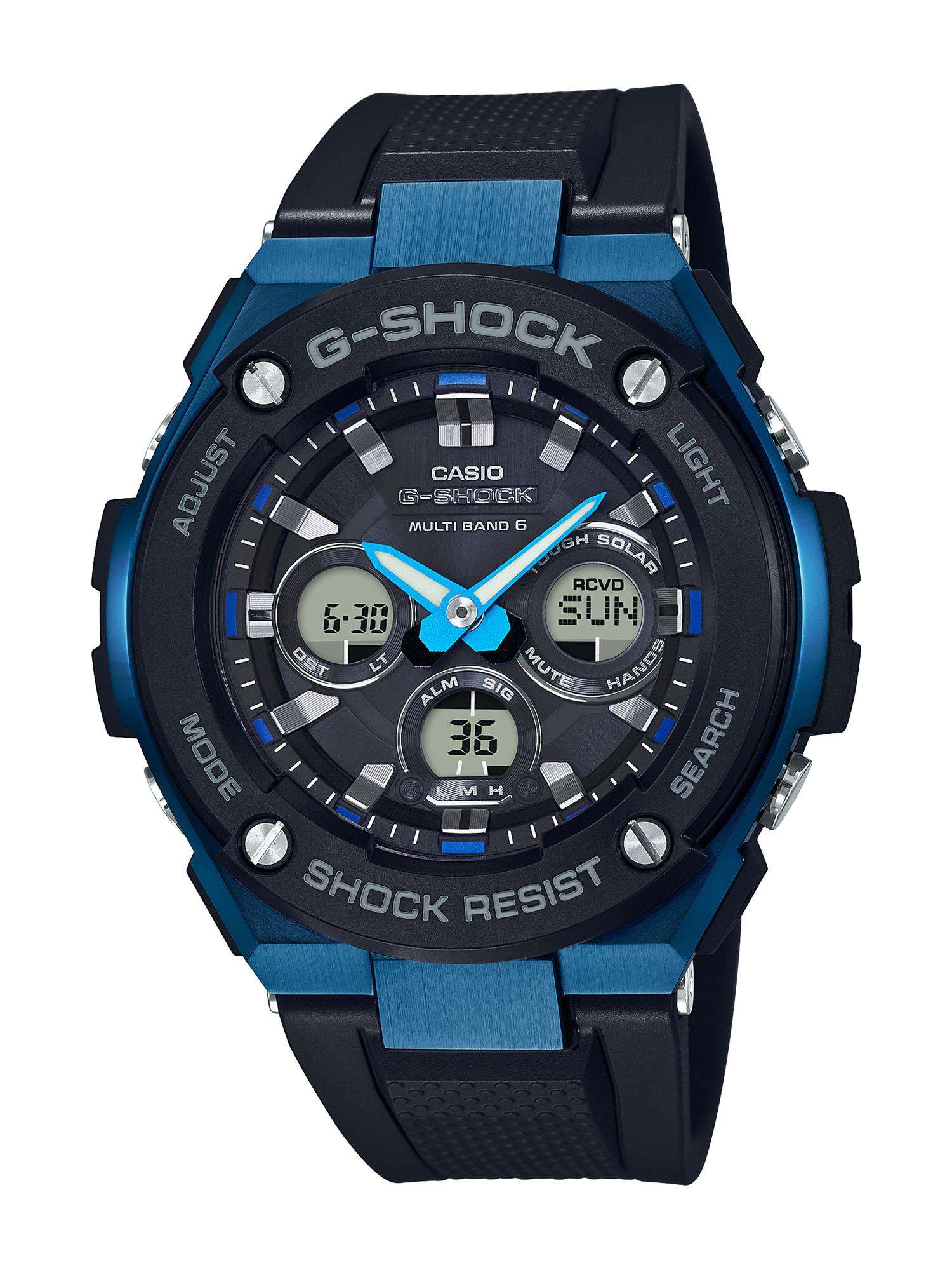 The Watch: Casio G-Steel Blue Men’s Alarm Chronograph GST-W300G-1A2ERThis Casio G-Steel Blue Men’s Alarm Chronograph (GST-W300G-1A2ER) retains the attractive metal finish of previous G-Steel models in a more compact and sleek case design. A diminished size does not come at the expense of functionality, as the watch also features shadow-dispersing solar panels, enhanced power-generating efficiency and Multi-Band 6 Radio controlled advanced timekeeping. Key Features:Auto CalendarBattery Level Indicator Countdown TimerHand Moving FunctionPower Saving FunctionMultiband 6 Radio ControlledStopwatchWorld Time FunctionNeobrite DisplayWater Resistant to 200m The Family: G-ShockAt a time when watches were seen as fragile, delicate instruments, Casio’s head of watch design, Kikuo Ibe, set out in 1981 to create “a watch that doesn’t break, even when dropped.” After 200 prototypes and two years of development, the Casio G-Shock was launched in 1983. Gaining its now legendary toughness from Ibe’s revolutionary decision to suspend the module inside a hollow rubber structure, the G-Shock has been the go-to name in superbly durable and precise wristwear ever since. The Brand: CasioCasio was established in 1946 by Japanese engineer Tadao Kashio. The company entered the timepiece market in 1974 with the release of the Casiotron, the world’s first Auto Calendar watch. Only eleven years after entering this field, Casio completely reshaped global thought about the function a watch should perform with the release of the pioneering and now legendary G-Shock family. Innovation and world firsts have defined the company’s history ever since, the most striking of these being the release of the first ever touch screen watch in 1991, 24 years before the Apple Watch, and the first ever wrist camera watch in 2000. In short, Casio was producing smartwatches decades before the term had even been coined. Add to this the hipster popularity of the company’s retro designs, and Casio has firmly cemented its reputation as a famously reliable and precise name in both analogue and digital watches.
