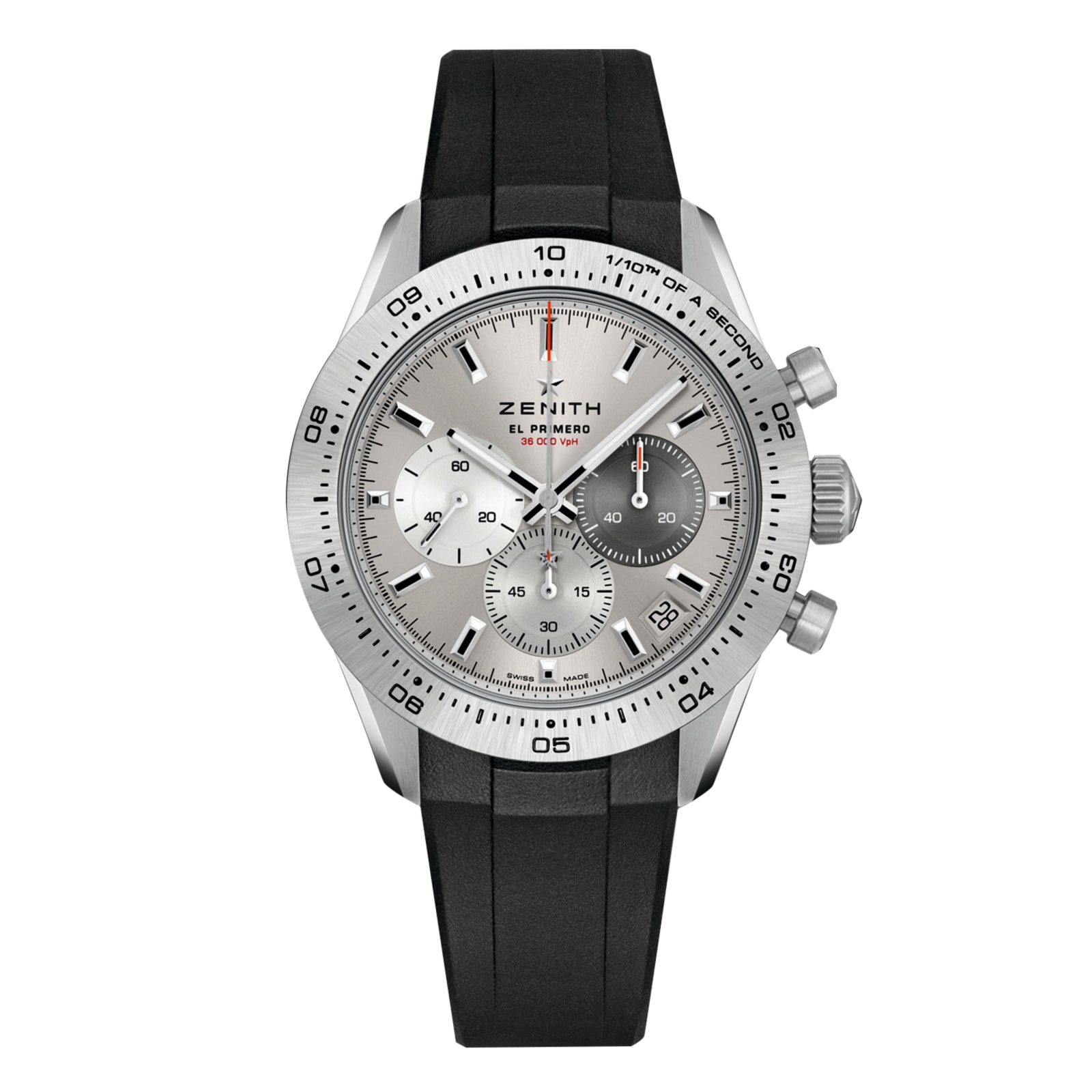 The CHRONOMASTER Sport is crafted in a 41mm titanium case with a brushed titanium bezel, paired with a nickel-grey sunburst tricolour dial and a black rubber strap. Powered by the El Primero 3600 automatic high-frequency chronograph movement with 1/10th of a second chronograph function and a power reserve of 60 hours.