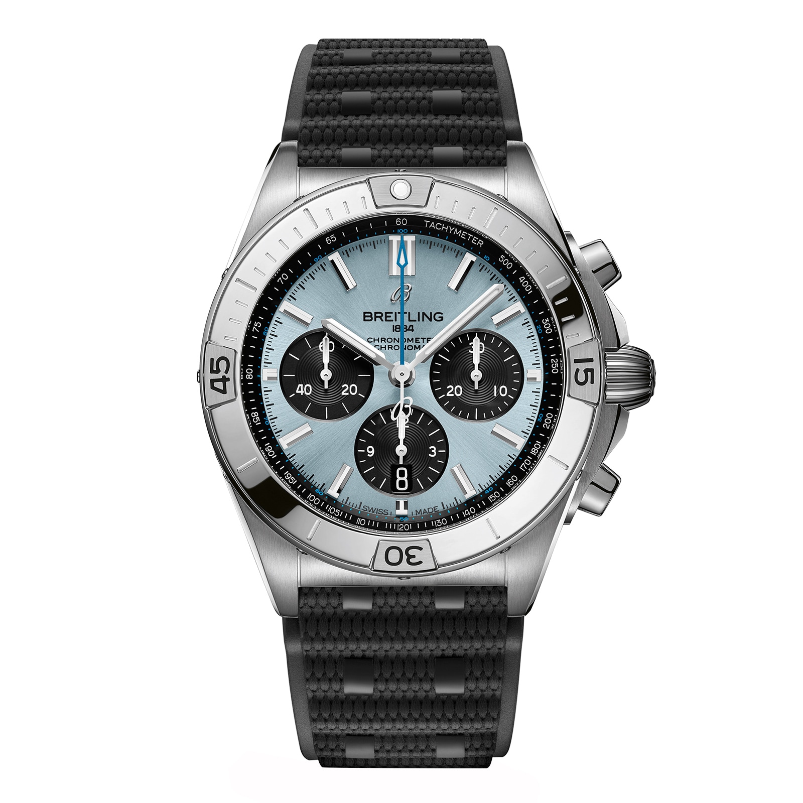 Inspired by style and elegance A 42mm stainless steel case protects an ice blue dial Powered by Breitling Manufacture 01 calibre movement Water resistance to 20 bar (200 metres) Presented on a black rubber strap THE CHRONOMAT COLLECTION Combining elements of sports and chic design, the Chronomat models are a versatile collection inspired by style and elegance. Featuring an array of vibrant dials, straps, and bracelets, all timepieces within the range are certified chronometers recognised by the COSC. WATCHMAKING EXCELLENCE The 42mm stainless steel case is presented on a black rubber strap and protects a statement ice blue dial. On the dial, you’ll find baton hour markers, silver toned hands, three sub-dials, and a date display at 6 o’clock. This timepiece is complete with Breitling Manufacture 01 calibre movement and water resistance to 20 bar (200 metres).