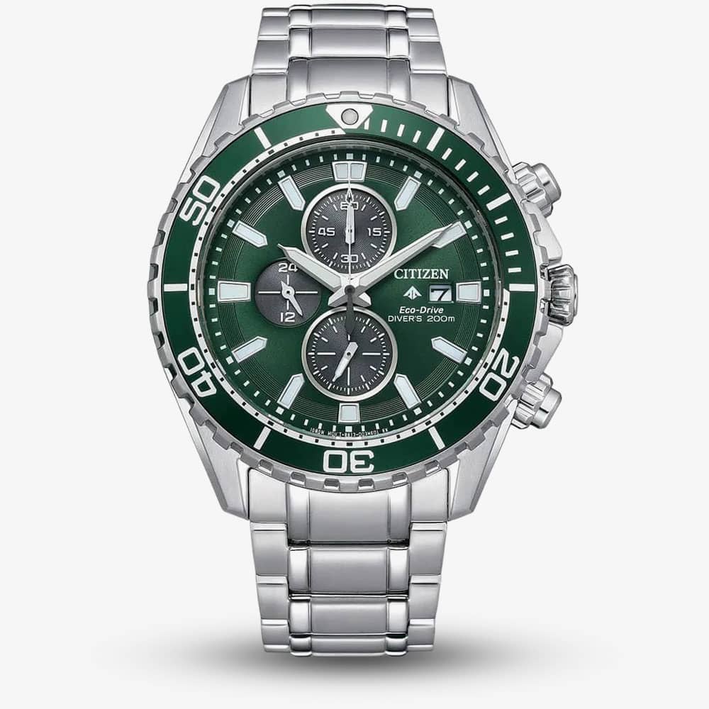 A Promaster collection gem, this ISO Compliant diving watch blends style and function seamlessly. It includes a one-way rotating bezel and a 1/5th second chronograph. Powered by Eco-Drive, eliminating the need for batteries. • Powered by the Eco-Drive movement, which harnesses light from both natural and artificial sources.. • Presented on a silver stainless steel bracelet with fold over clasp. • Mineral crystal glass. • 44mm case width. • 200 metre water resistance.