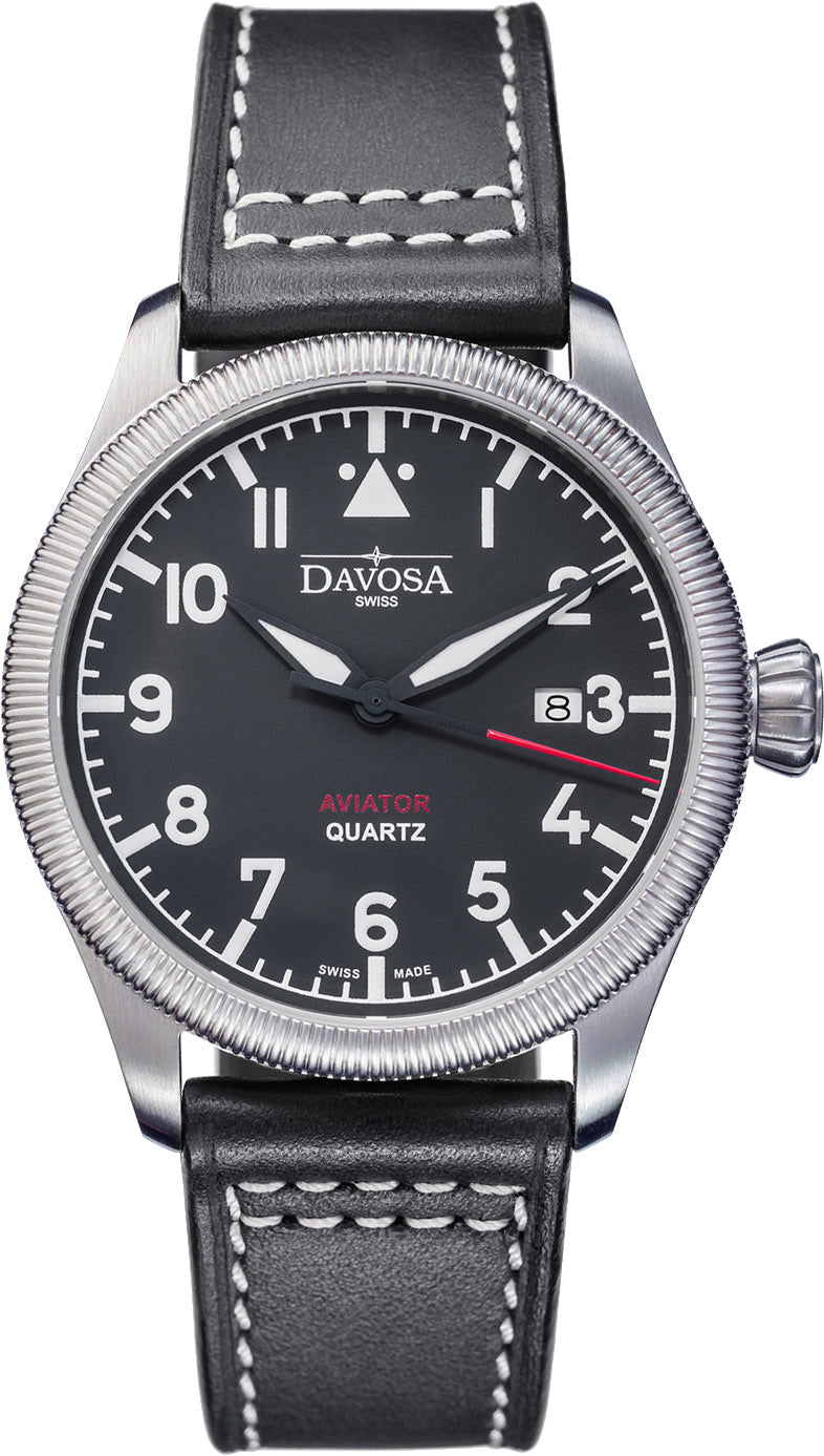 Davosa Watch Aviator Quartz Black 16249855. The Davosa Aviator Quartz proves once again why pilots watches are the second most popular category of wristwatch after divers watches: they make a strong statement in high quality, masculine design.The satined, partially polished, stainless steel case with its 42 mm diameter, 11 mm height and a water resistance of 5 ATM is contained by a fluted bezel and topped by scratch resistant sapphire crystal. The clean design provides clear indices, large, easily readable figures and hands set against a black, blue or silvery white dial, depending on your choice. The look is complemented by a robust blue, black or brown leather strap with contrasting stitching and a pin buckle. And finally, the seconds hand has a pleasing detail to offer: the outer part is red, thus increasing readability and underscoring the autonomous design of this stylish wristwatch.