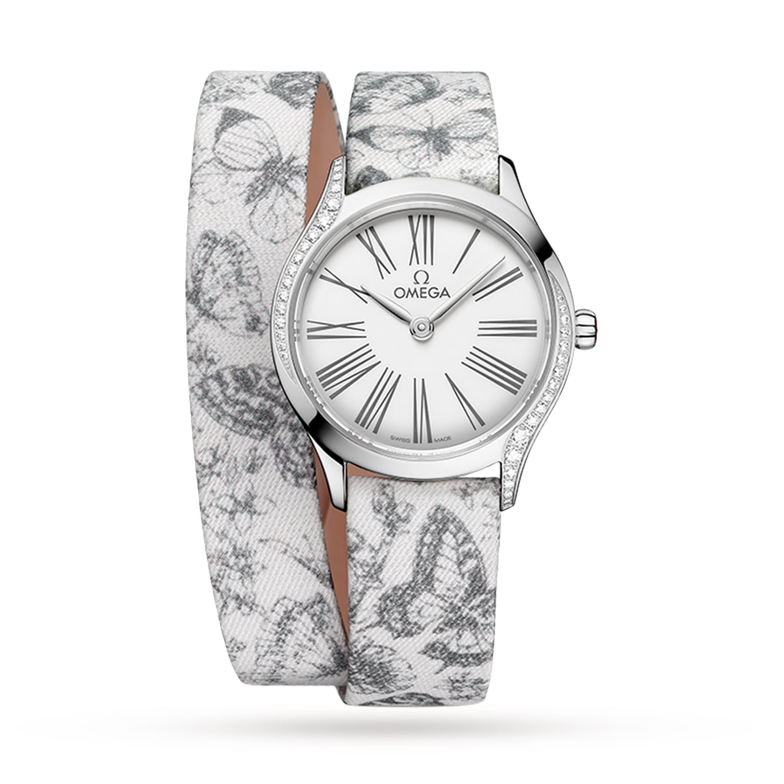 Inspired by Omega’s Tresor collection Driven by the 4061 calibre quartz movement A single diamond set in the crown26mm stainless steel case paired with a double tour bracelet White enamel dial with diamond polished hands DYNAMIC DESIGNInspired by Omega’s Tresor collection, the Mini Tresor models offer compact size, unique colours, and straps. This developed collection features dynamic design, diamond curves, and exclusive fabric patterns for a truly stunning display. A DAZZLING DIAMONDThis model features a 26mm stainless steel case presented on a double tour fabric bracelet with a black butterfly design and pin buckle securement. A single diamond is set in the crown of the watch while the white ‘Grand Feu’ enamel dial boasts diamond polished, rhodium-plated hands and grey Roman numerals. For prolonged battery life and the highest level of accuracy, this timepiece is driven by 4061 calibre quartz movement.