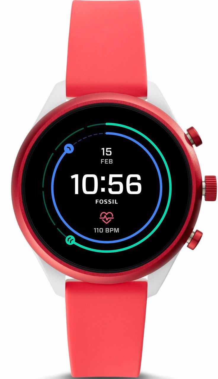 Fossil Watch Sport Smartwatch Red Silicone FTW6027P. Fit for every style, this ultra lightweight 41mm Sport smartwatch features a neon silicone strap, lets you track your heart rate, track your workout, even swimming, customise your dial and more. Smartwatches powered with Wear OS by Google are compatible with iPhone¨ and Android phones. Wear OS by Google and other related marks are trademarks of Google LLC. Touchscreen smartwatches powered with Wear OS by Google require a phone running Android OS 4.4+ or iOS 9.3+. Supported features may vary between platforms.