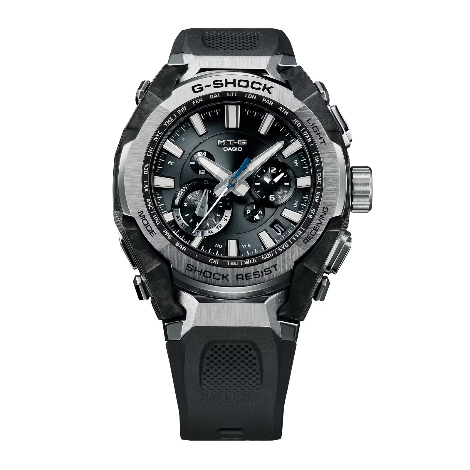 Introducing the cutting-edge fusion of form and function with the MTG-B4000 where advanced metal components merge with the original G-SHOCK resin to redefine rugged sophistication. The MTG-B4000 presents a next-generation Dual Core Guard structure, crafted with the support of artificial intelligence and a reimagined frame design that artfully blends carbon fibre and stainless steel. This revolutionary exterior sets a new standard, balancing durability and elegance in a bold design evolution. Blending AI innovation with expert human craftsmanship, this watch embodies a seamless integration of material, architecture, and aesthetic. Designers developed the base form, which was then enhanced through AI simulations to produce an optimised 3D structure-ultimately refined by hand to create a timepiece that unites functional performance with organic beauty. The frame’s dynamic, multi-dimensional shape is precision-cut from laminated carbon and glass fibre sheets, revealing a striking, layered visual. The stainless steel bezel components are meticulously finished with both hairline and mirror polishing, achieving a sophisticated and tactile contrast. Engineered with Triple G Resist technology, the MTG-B4000 stands resilient against shock, centrifugal force, and vibration. The case back, crafted via metal injection moulding (MIM), adds structural depth and reinforces its robust character. Every detail is considered-from the high-clarity sapphire crystal to the finely crafted dial, produced using advanced processing techniques at Yamagata Casio. Built to perform as impressively as it looks, the MTG-B4000 offers smart connectivity via the CASIO WATCHES app, Bluetooth® pairing, Multiband 6 radio control, Tough Solar charging, and a high-brightness LED light. This is more than a timepiece-it’s a statement of technological artistry, ready to accompany you on any adventure.