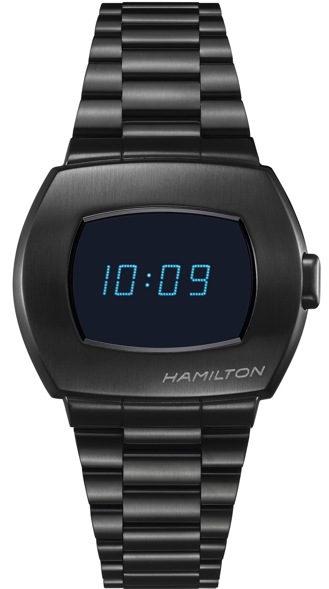 Hamilton Watch American Classic PSR Digital Quartz H52404131. The story of innovation, synonymous with the debut of the world’s first digital watch in 1970, continues with this sleek all-black model of the iconic Hamilton PSR Digital quartz. Featuring a hybrid LCD and OLED digital display, its cool blue numerals can be read at a glance during the day and with the push of a button at night.