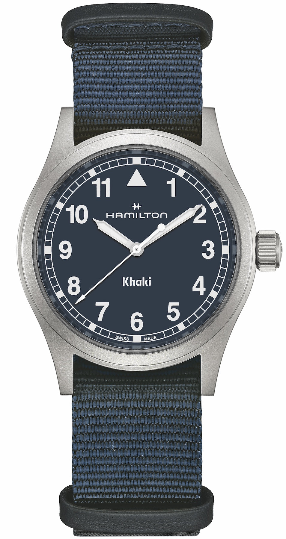 Hamilton Watch Khaki Field Quartz H69401940. The Khaki Field Quartz expresses a return to Hamilton’s military heritage through simplicity in design. The dial features a clear typography with straighter Arabic numerals and a “railway” minute track. The color palette is understated, with its sleek blue dial highlighted by white Super-LumiNova indexes. The watch comes with a blue textile NATO strap and blue leather loops – perfect for your next adventure out in the field.