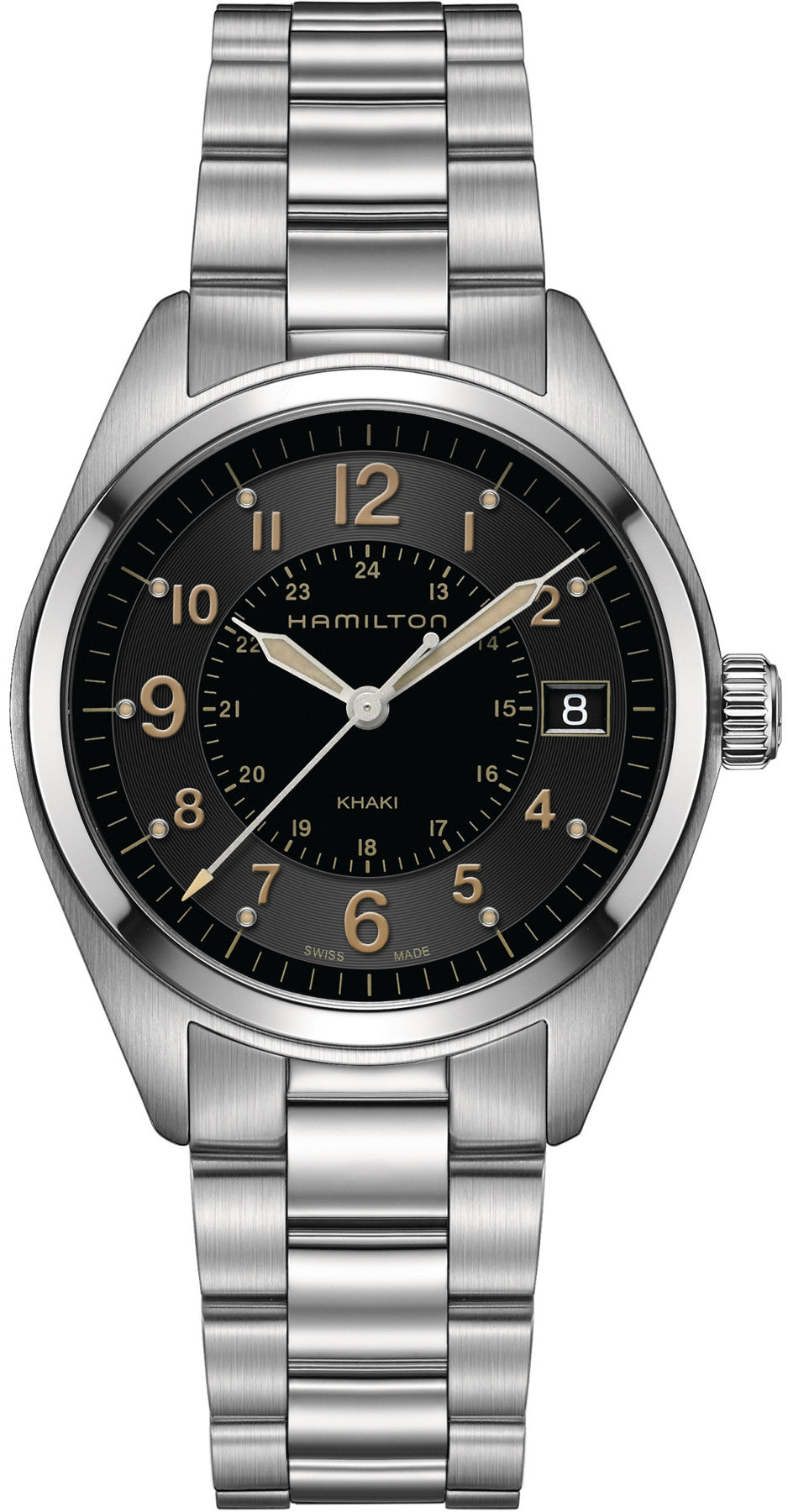 Hamilton Watch Khaki Field Quartz. Presenting an astounding array of luxurious timekeeping characteristics, the Hamilton watch from the reliable Khaki Field collection, balances elegance with dynamism. Colour contrasts which emerge from the light golden browns of the Arabic numbering on the dial together with the rich black display and stunning silver shades from the stainless steel casing, make for a truly exquisite interpretation of time. The Hamilton Khaki Field watch is a 40mm timepiece which boasts a beautiful needle thint seconds hand with light brown arrow tip and a highly legible date window which rests at the 3 o clock location. The solid stainless steel structure with screw down crown and masculine designed lugs, has been finished with brushed effect to the material. The Hamilton lettering boasts from underneath the 12 o clock mark, balanced by the prestigious Khaki logo which reinforces authenticity above the 6 o clock location. The quartz movement is protected from 50 meters of water resistance along with other external factors, thanks to its anti reflective and scratch resistant sapphire crystal glass coating. The design of the Hamilton Khaki Field watch takes inspiration from those timepieces developed in the 1940s to aid the US Navy during the Second World War. Finished on a beautiful, robust stainless steel bracelet with foldable clasp, the timepieces harks back to Hamilton’s profound military heritage where each instrument needed to be built with uniform exactness. Supplier model number H68551133