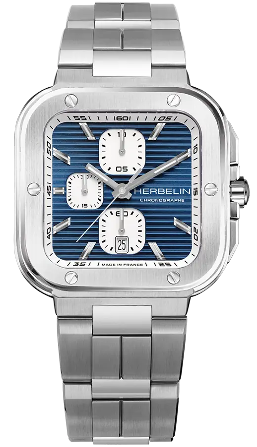 Herbelin Watch Cap Camarat Square Chronograph 35646B25. The CAP CAMARAT Square Chronographe Bleu is a men’s model that combines sporty elegance and precision watchmaking. This model features a stainless steel case with a neo-vintage design, where robustness is accentuated by polished facets and a bezel adorned with six decorative screws aligned with the hour-markers. The notched crown attracts attention, while the push-buttons have been designed to blend harmoniously into the case. The intense blue dial, stamped horizontally, is punctuated by three C-shaped white counters and a date window at 6 o’clock. These counters display small seconds, 1/10th of a second and 30 minutes, thus integrating all the essential chronograph functions. The striking contrast between the white counters and the blue dial ensures excellent legibility. An elegant seconds hand adds an extra visual dimension to the whole. The steel link bracelet, designed for exceptional comfort and long life, is integrated into the case, amplifying the sporty-chic look of the watch. Equipped with a sapphire crystal and water-resistant to 100 meters, the CAP CAMARAT Square Chronographe Bleu runs on a SW200-1 – 11 ½”’ quartz movement, guaranteeing high reliability. This model is a must-have for refined watch lovers looking for a functional, masculine and urban watch.