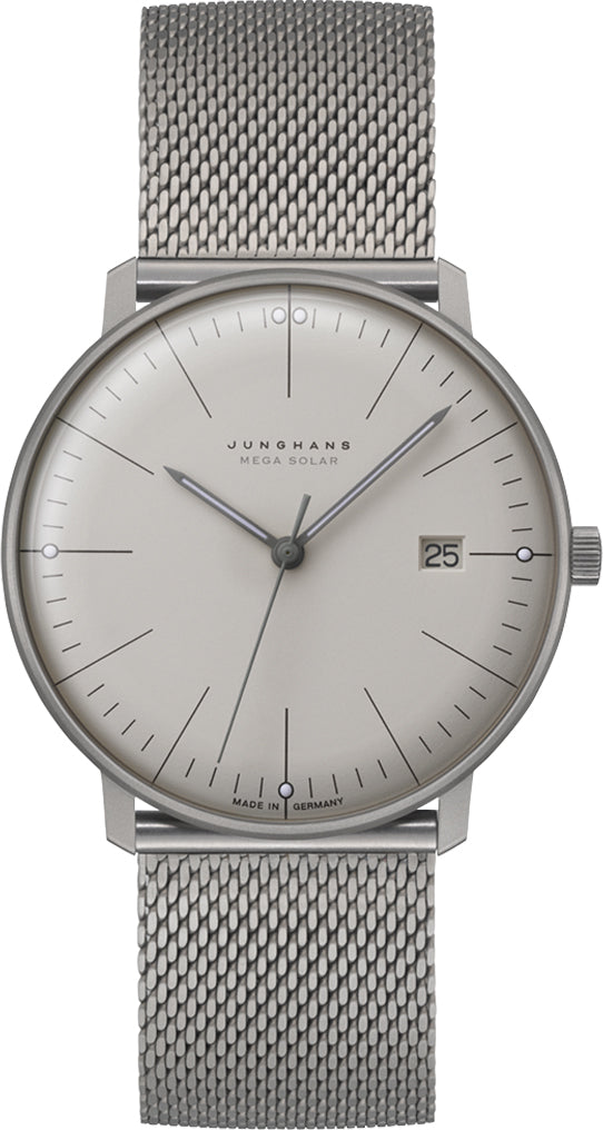 Junghans Watch Max Bill Mega Solar Sapphire Crystal. 59/2022.46 This Junghans Max Bill MEGA Solar watch combines the brand’s legendary Max Bill design renowned for its minimalist and simple aesthetic with one of their iconic radio-controlled solar powered movements. The beauty of this movement comes from its ability to be powered entirely by natural and artificial light, meaning you will never have to change the battery in this Junghans Max Bill watch. The state of the art movement also comes with a perpetual calendar function and the easy adjustment of time zones which can be done using the crown or through the Junghan’s MEGA smartphone app. Thanks to the 38mm case engineered from lightweight titanium and the contemporary titanium mesh-style bracelet with folding buckle, the Junghans Max Bill MEGA Solar watch sits effortlessly and comfortably on the wrist. The radio-controlled solar movement J101.85 is kept hidden behind a screw down case back and is powered by light exposed on the matte light grey dial. The dial is decorated with luminous hands and indices and protected by curved sapphire crystal glass coated with anti-reflective treatment. The Junghans Max Bill MEGA Solar watch also provides central hands for hours, minutes and seconds, a date window at 3 o clock and promises a water resistant rating of 30 metres.