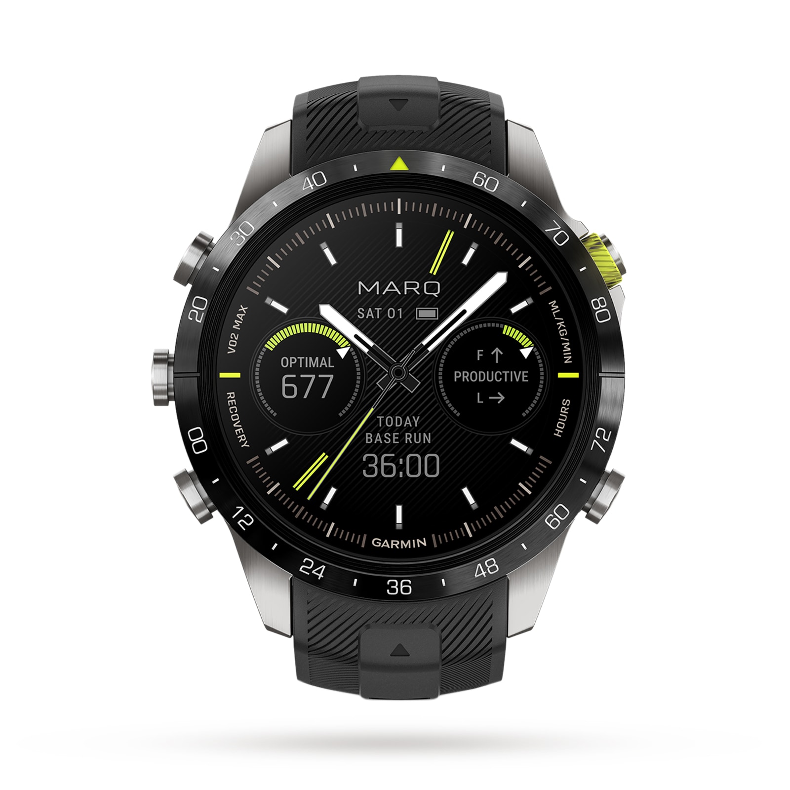 Set the goal. Strive for victory. MARQ® Athlete (Gen 2) is a modern tool watch like no other. It’s built from grade-5 titanium to be harder and stronger, with a stunning new AMOLED touchscreen display that gives you up to 16 days of battery life in smartwatch mode and up to 42 hours in GPS mode. Train with a wide variety of built-in sports apps, then push your limits with performance metrics and endurance and stamina tracking. Preloaded Topo Active maps with Next Fork™ help you see the distance to the next trail intersection as well as the name of the upcoming trail. Athletes that never settle for anything but their best have found their match. Premium-crafted tool watch features an athletic design with a 46-mm case made of ultra-hard, grade-5 titanium and diamond-like carbon coated bezel with V02 max and recovery time markings plus a high-performance rubber strap with Quick Fit® mechanism Features a stunning AMOLED touchscreen display with domed sapphire lens Incredible battery performance to keep up with your training, with up to 16 days of battery life in smartwatch mode and up to 42 hours in GPS mode Cutting-edge performance and training features include a wide variety of activity profiles plus advanced running and cycling dynamics (when paired with compatible sensor, sold separately), performance metrics, training load and the ability to track endurance and stamina New jet lag adviser feature helps you minimize the effects of jet lag by giving you guidance on light exposure, sleep schedule and exercise based on your destination Preloaded Topo Active maps with Next Fork™ are more glanceable, helping you navigate trails and see beyond the next turn Easy-to-use buttons that work in almost any environment complement an ultra-responsive touchscreen to improve your daily smartwatch experience and map interaction Multi-band GNSS with Sat IQ™ technology secures the best positioning accuracy in any environment while also optimizing the device’s battery life Smartwatch functionality,
