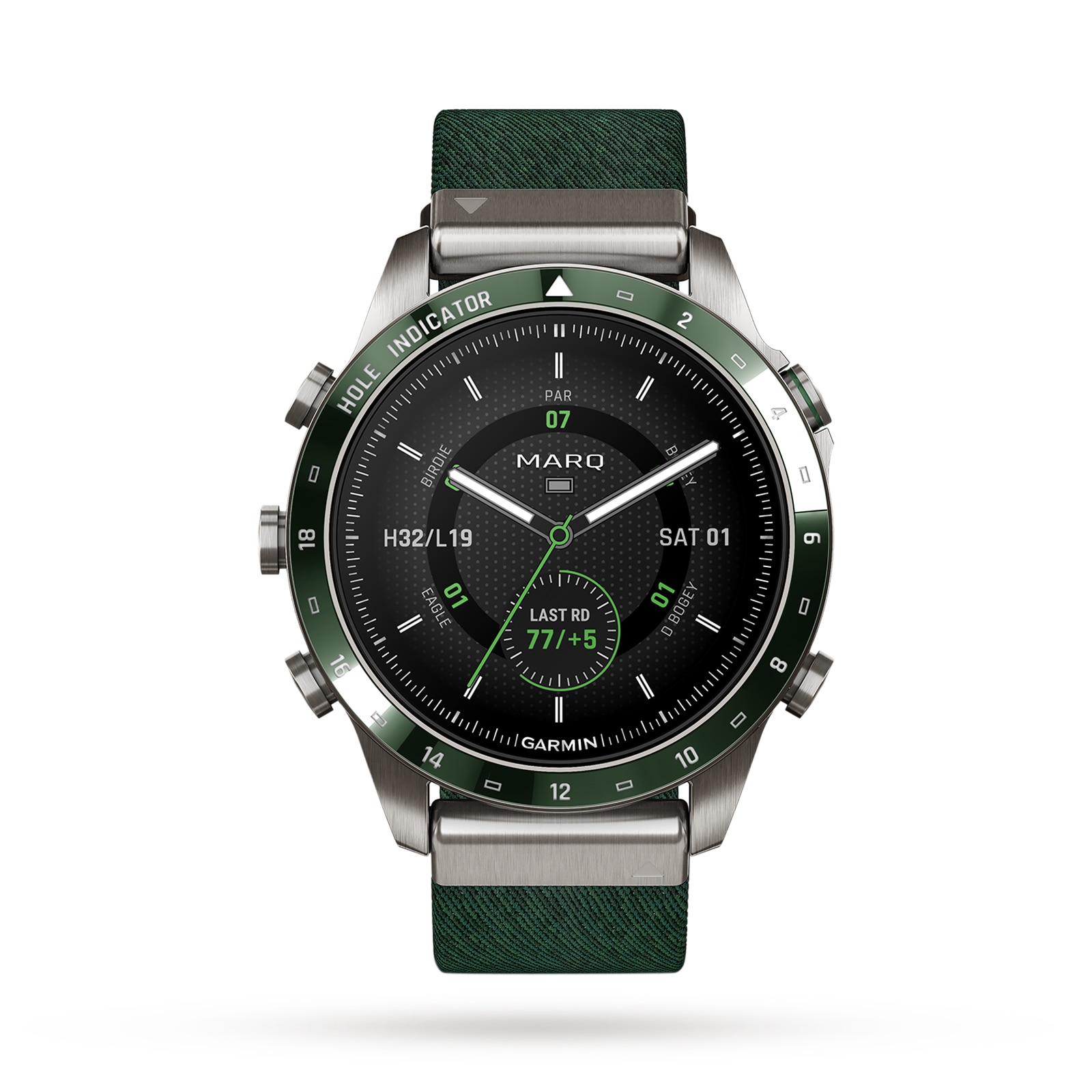 Never settle. Aim for glory. MARQ® Golfer (Gen 2) is a modern tool watch like no other. It’s built from grade-5 titanium to be harder and stronger, with a stunning new AMOLED touchscreen display that gives you up to 16 days of battery life in smartwatch mode and up to 42 hours in GPS mode. With more than 42, 000 preloaded golf courses and Garmin’s most advanced game-tracking data ever with Virtual Caddie to tell you what to hit and where to aim, you’ll be able to take your performance to entirely new heights. Premium-crafted tool watch features a precision design with a 46-mm case made of ultra-hard, grade-5 titanium with pine green ceramic inlay hole indicator. An intricate jacquard weave nylon strap has a premium Quick Fit® mechanism Features a stunning AMOLED touchscreen display with domed sapphire lens and custom 1-18 golf hole markings on the ceramic bezel inlay Incredible battery performance to keep up with your adventures, with up to 16 days of battery life in smartwatch mode and up to 42 hours in GPS mode Preloaded with more than 42, 000 golf courses worldwide and full-colour Course View mapping right on the wrist; quickly reference distances to the front, middle and back of green Get our most advanced set of golf features including Virtual Caddie, Hazard View, Wind Data, Pin Pointer and more so you can play your best. Green Contour data also available with a Garmin Golf™ membership Auto Shot round analyser measures and auto-records detected shot distances¹ and pairs with included Approach® CT10 club tracking sensors for more automatic game tracking capabilities New jet lag adviser feature helps you minimize the effects of jet lag by giving you guidance on light exposure, sleep schedule and exercise based on your destination Easy-to-use buttons that work in almost any environment complement an ultra-responsive touchscreen to improve your daily smartwatch experience and map interaction Multi-band GNSS with Sat IQ™ technology secures the best positioning accuracy in any envi