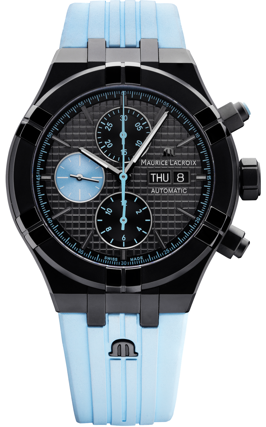 Maurice Lacroix Watch Aikon Automatic Chronograph Sprint AI6038-DLB01-330-4. With their dynamic angles and pronounced polished and satin finished surfaces, the Maurice Lacroix Watches Aikon Automatic models have a real presence on the wrist. Extremely soft and supple, it suits all wrists. The dials of the Aikon Automatic pieces present bold textured patterns.