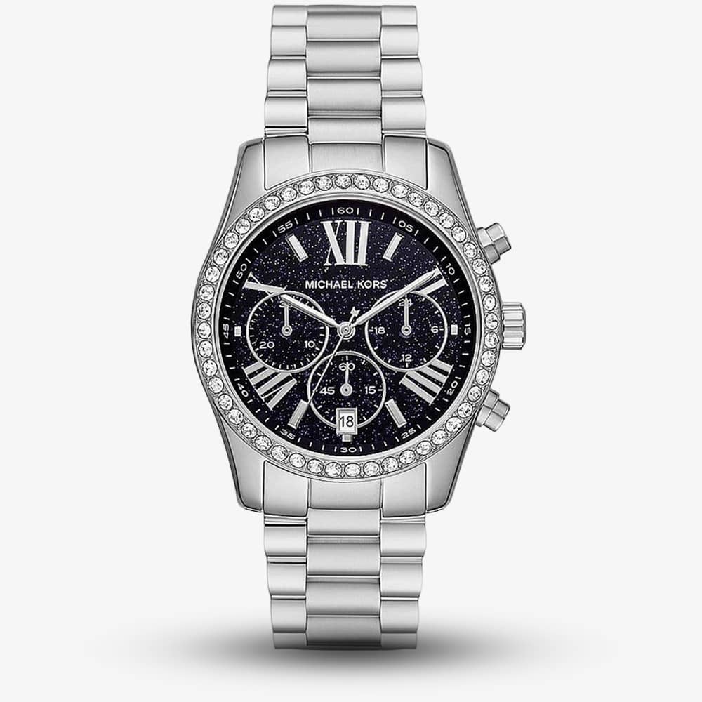 The Michael Kors Lexington MK7277 watch combines a 38mm round shaped stainless-steel case with sparkling crystal set bezel and a stainless-steel bracelet with a push button deployment clasp. It has a navy-blue glitter analogue dial with luminescent hands, date display & chronograph sub-dials which are protected beneath a mineral crystal glass. Power is generated by the quartz movement. This model also has a water resistance of up to 100 metres.