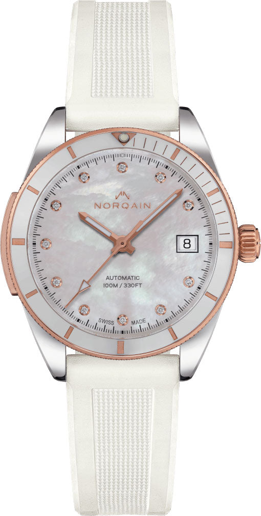 Norqain Watch Adventure Sport Rubber N1800CG89A/M18DG/18WRE.16S. The Adventure line embodies the thrill of exploring and conquering nature’s playground – the trails, the summits and the tides. The robustness of these powerful watches prepares them for whatever nature throws your way. The signature NORQAIN dial pattern, rotating bezels and uniquely sturdy construction make the NORQAIN Adventure timepieces equipped for a lifetime of adventurous moments. The Adventure collection has a strong character that speaks to sporty allrounders who are always on the search for a new challenge.