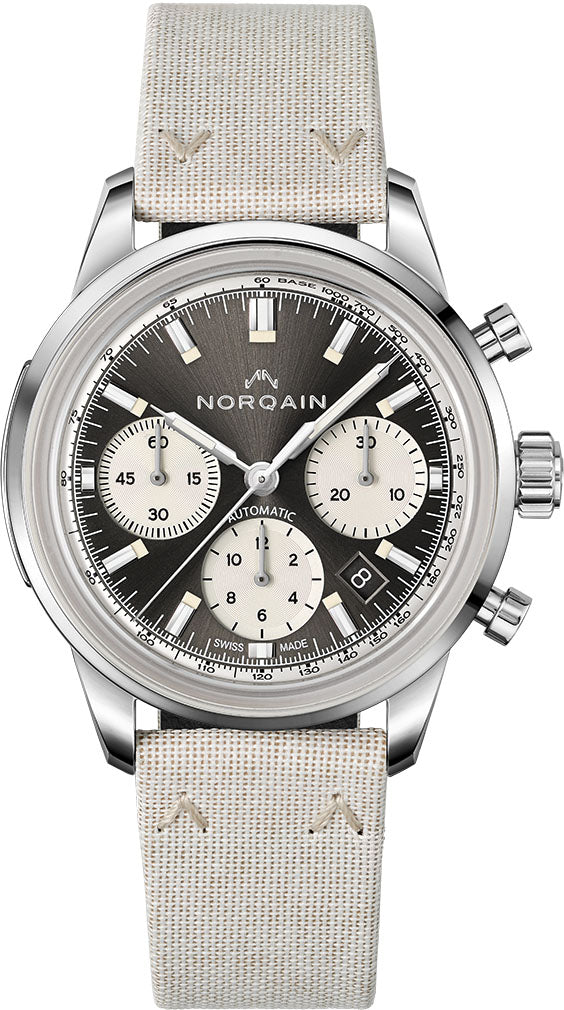 Norqain Watch Freedom 60 Chronograph Nortide Linen N2201S22C/T221/20INT.18S. The Adventure line embodies the thrill of exploring and conquering nature’s playground – the trails, the summits and the tides. The robustness of these powerful watches prepares them for whatever nature throws your way. The signature NORQAIN dial pattern, rotating bezels and uniquely sturdy construction make the NORQAIN Adventure timepieces equipped for a lifetime of adventurous moments. The Adventure collection has a strong character that speaks to sporty allrounders who are always on the search for a new challenge.