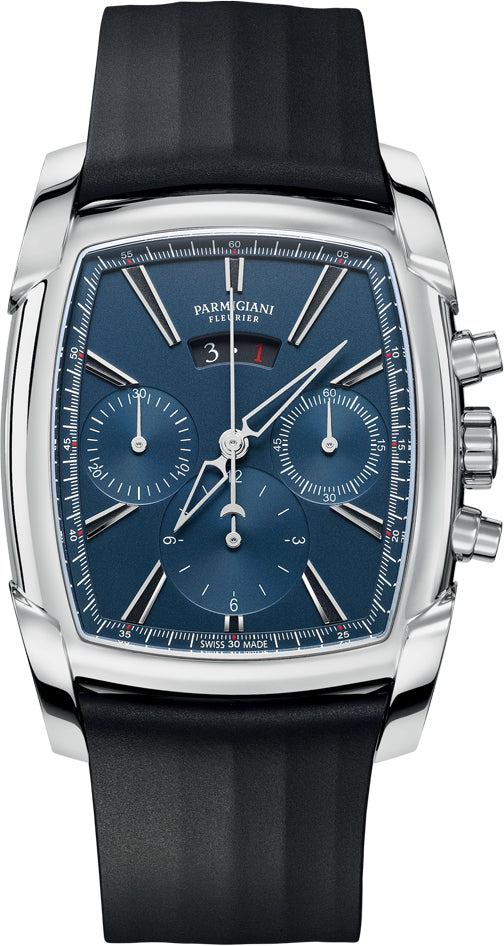 Parmigiani Fleurier Watch Kalpagraphe Chronograph PFC128-0002500-X01402. The chic and sporty spirit of the Parmigiani Fleurier watches Kalpagraphe collection is designed to perpetuate the elegance of the Parmigiani Fleurier style. While its contemporary look is made all the more imposing by the streamlined case and dynamic dials, the refinement demanded by the values of Haute Horlogerie is reflected in every detail.