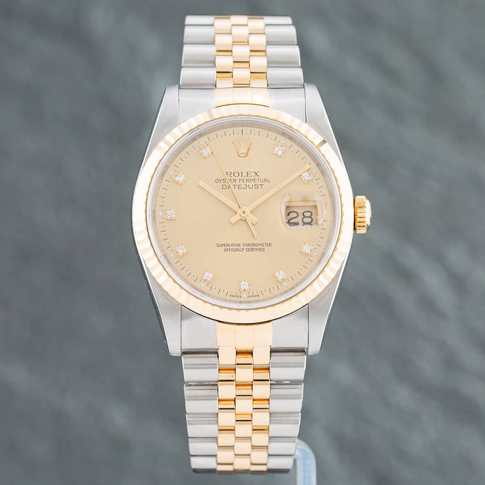 The Rolex Datejust Diamond Dot Dial Watch combines a round shaped stainless steel case and two colour stainless steel bracelet with a fold over clasp. The silver 36.0mm case measures 12.0mm thick and has a gold 18ct yellow gold fixed bezel with a screwed in case back and a lug width of 20mm. The champagne analogue dial is protected beneath scratch resistant sapphire crystal glass and has diamond hour markers, as well as luminescent hands, and a date display. Power is generated by the chronometer certified automatic movement with a power reserve of up to 48 hours. The watch is set with diamonds and weighs 100.9 grams. This model also has a water resistance of up to 100 metres. – Model Number 16233 – Serial Number *****105 – Year of Manufacture 1989 This watch is supplied with its original box and paperwork. The Jewel Hut are giving you the opportunity to purchase a prestigious Pre-Owned Rolex watch at an affordable price. The authenticity of our Pre-Owned Rolex collection is verified by industry experts, and comes complete with Rolex presentation box, professionally refurbished to the highest possible quality and standard. Click here to view our entire Pre-Owned Rolex collection Alternatively, to make enquiries or view items in person please call or visit your local T.H. Baker store. Click here to find your nearest store