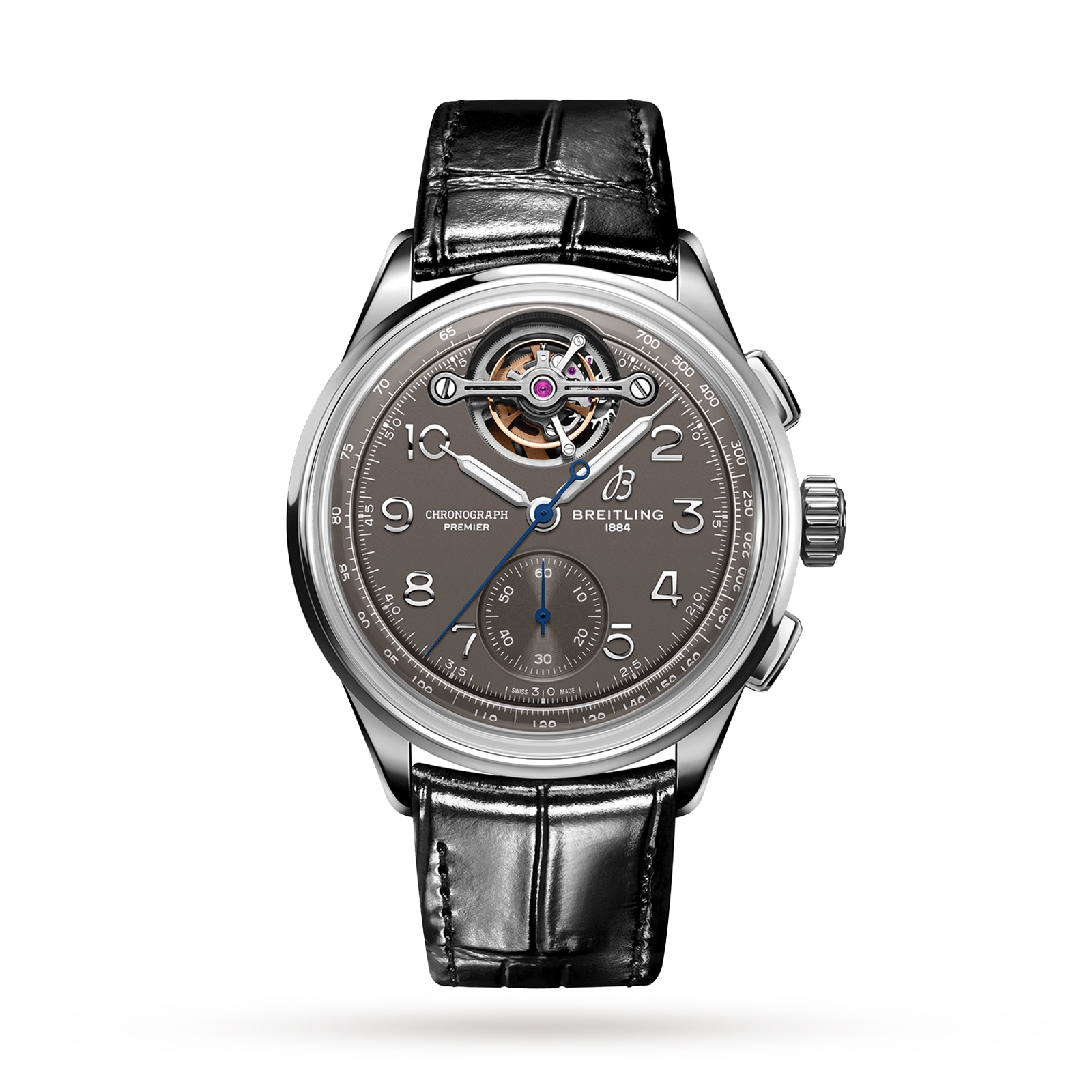 Premier – a tribute to three generations of inventors – Léon, Gaston, and Willy Breitling Designed for those who love the mechanics and magic of watchmaking Housed in a 42mm 18K white gold case with a black alligator leather strap Grey dial with a tourbillon taking centre stage at 12 o’clock Powered by the B21 calibre movement with a 55-hour power reserve AN UNMISTAKABLE STAMP OF IMPECCABLE TASTE Breitling’s first watch dedicated entirely to style, the Premier collection features elegant details and modern-retro touches. Named after each of the brand’s founders, Leon, Gaston, and Willy, the three models in this collection feature stylised square pushers and Arabic numerals, while the symmetrical dial design, harmonious interplay of numerals and tone-on-tone colourways perfectly balance the undisputed star of the show – the tourbillon. A WONDERFUL EXAMPLE OF WORLD CLASS TIMEKEEPING This striking model features a 42mm 18K white gold case paired with a sophisticated, black alligator leather strap. But the true highlight of the design is the captivating grey dial with a tourbillon at 12 o’clock. On the reverse, the open sapphire case back is domed to provide a clear view of the incredible B21 movement, developed with boutique movement maker La Joux-Perret.