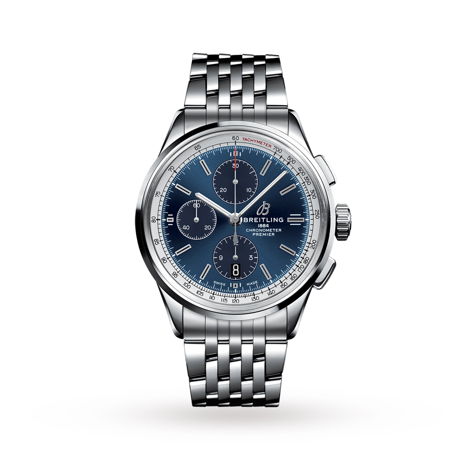 Launched in the 1940s, the Premier collection from Breitling was dedicated to elegance. Now an iconic part of the luxury brand, the new collection echoes the effortless charm of the original models. Powered by a Breitling 13 Calibre self-winding mechanical movement, this luxury Premier watch is water resistant up to 100 metres and provides a 48-hour power reserve. Housed by a robust 42mm stainless steel case and presented on a matching stainless steel bracelet, this smart and classic design features an eye-catching blue dial, framed by a white tachymeter scale. Protected by sapphire crystal glass, the dial is complete with silver-toned hands and hour markers, a date display window at 6 o’clock and three chronograph sub-dials for maximum functionality. Explore the full Breitling collection.