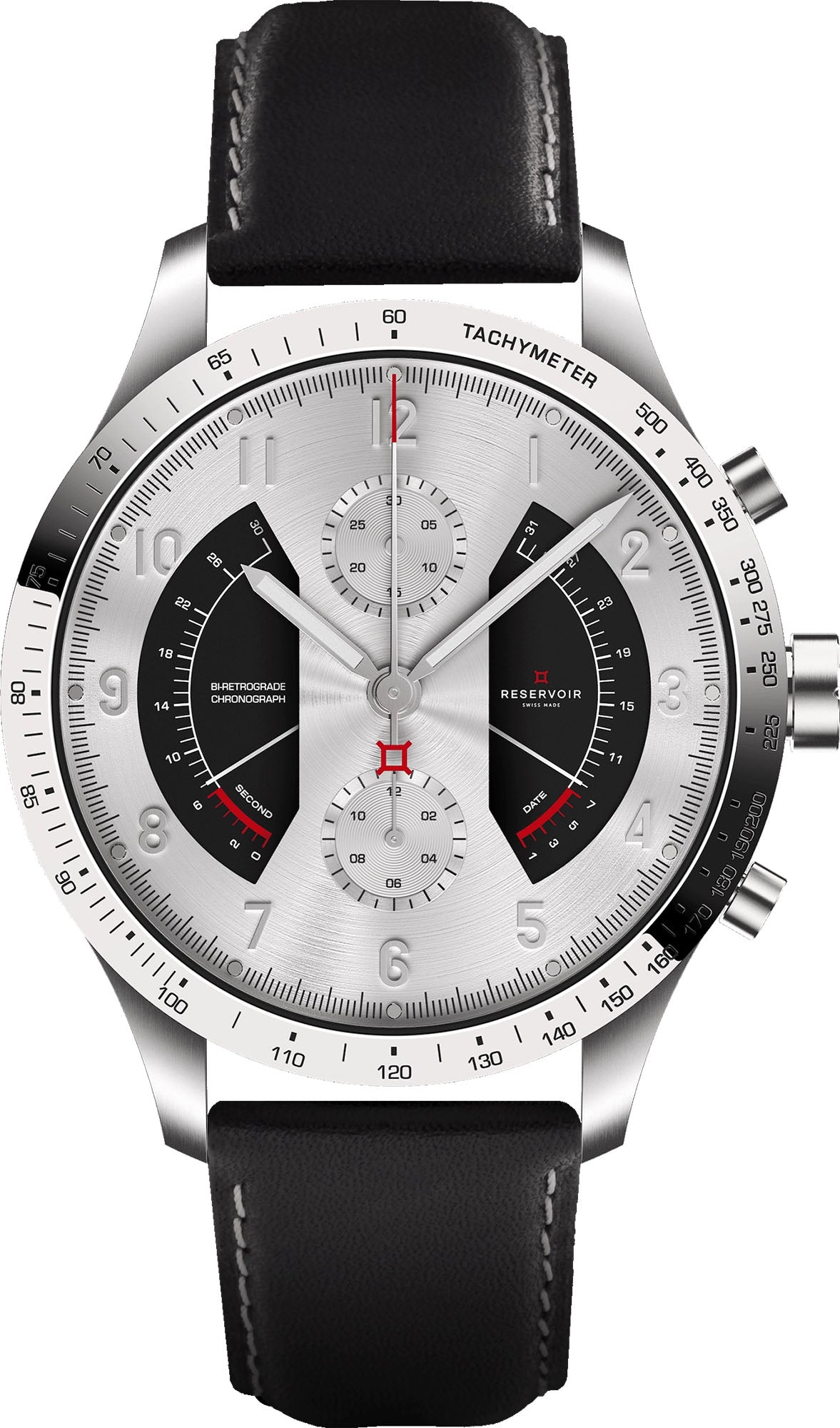 Reservoir Watch Sonomaster Chronograph Modern RSV04.SN/136.SI. RESERVOIR applies the measuring of sound to the measuring of time ! The two retrograde hands of the new RESERVOIR Sonomaster Chronograph faithfully reproduce the hands of power measurements or VU meters from analog stereo amplifiers. A tribute to the human quest for a ‘pure’ sound, a musical exploration full of audacity and intensity. This bi-retrograde (date and seconds at 120°) watch inaugurates the first chronograph model from RESERVOIR (central second, 30-minute counter at 12, hour counter at 6). The watch is powered by the new watchmaking caliber RSV-Bi120: a manufacture bi-retrograde chronograph movement, automatic mechanical winding, and column wheel (base LJP-L1C0).