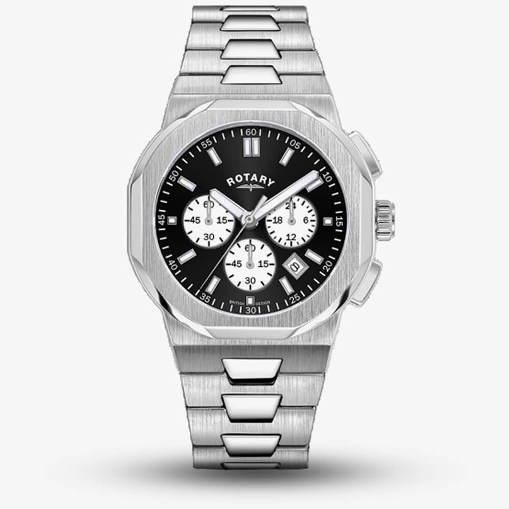 The Rotary Mens Regent Chronograph GB05450/65 watch combines a 41mm round shaped brushed stainless-steel case and brushed stainless-steel bracelet with a push button deployment clasp. It has a sunray black analogue dial with luminescent hands, date display & chronograph sub-dials which are protected beneath a scratch resistant sapphire crystal glass. Power is generated by the quartz movement. This model also has a water resistance of up to 100 metres. Case Depth. 11.35mm.