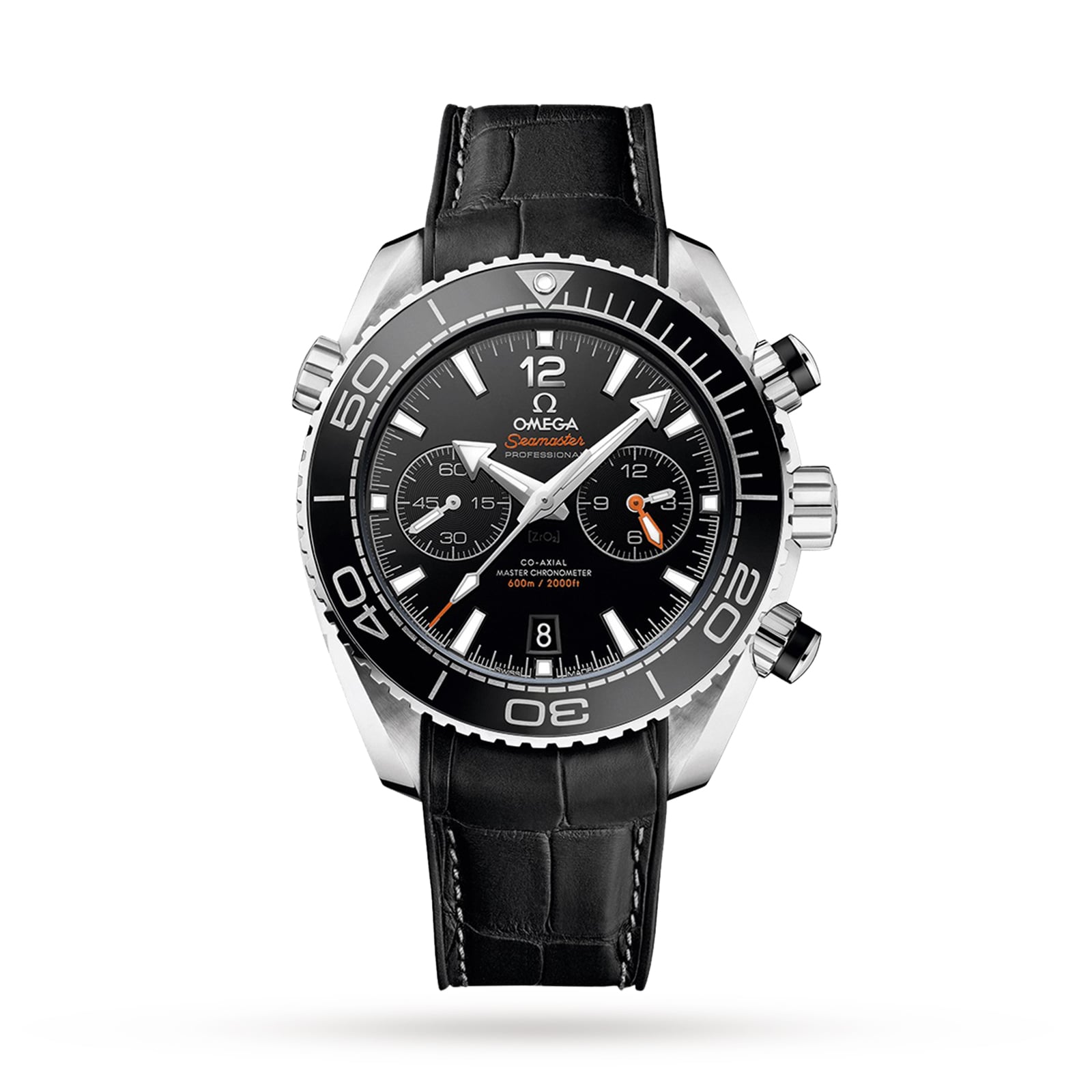 A celebration of Omega’s dive watch legacy Seamaster heritage with the 9900 calibre movement Water resistant to 60 bar (600 metres) 45. 5mm stainless steel case paired with a black leather strap with a rubber lining Master chronometer certified by METASOCEAN HERITAGE A wonderful tribute to Omega’s rich maritime legacy, the Planet Ocean collection has become iconic since it was launched in 2005. Designed to meet the unique needs of divers, the 600m collection celebrates the brand’s ocean heritage with the addition of modern design, creative touches, and revolutionary Master Chronometer movements. This performance-focused range is equipped with Super-Lumi Nova coated indexes for visibility underwater, and water resistance to 60 bar (600 metres).DESIGNED FOR DIVINGThis 45. 5mm timepiece features a black ceramic dial with vibrant orange accents, a date window at 6 o’clock, a small seconds sub-dial, and 60-minute and 12-hour counters. Presented on a classic stainless steel case, paired with a stainless steel bracelet, the black ceramic bezel features a diving scale in Omega Liquidmetalâ„¢, providing exceptional visibility at any depth. Visible through the transparent, screw-in caseback, the 9900 calibre movement ensures incredible power and precision.