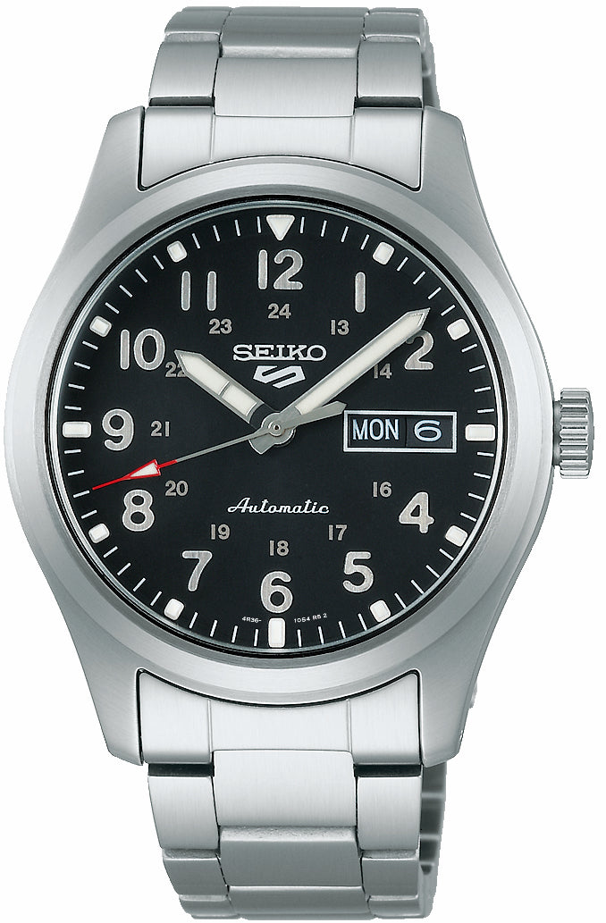 Seiko Watch 5 Sports Field Mens SRPG27K1. Seiko 5 Sports Field collection These watches have been created with an ‘in the field’ military design – taking inspiration from a style originally called a ‘trench watch,’ created to be robust and reliable – echoing the Seiko 5 Sports characteristics. Seiko 5 Sports is known for over fifty years of reliability, durability, performance and value. ”5” represents the original five key features of every Seiko 5 still present today: Automatic movement, Day-date display, Water Resistance, Recessed crown and Durable case and bracelet.