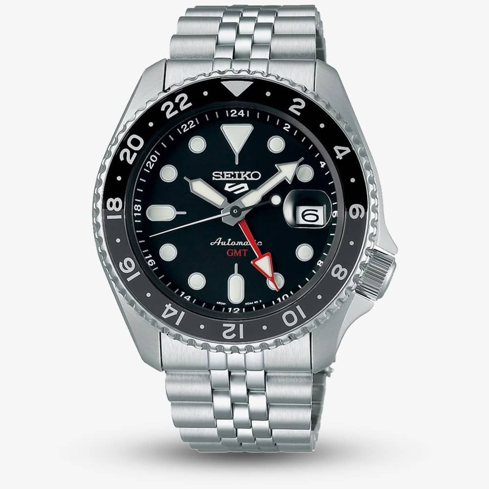 The Seiko 5 Sports ‘Black Grape’ GMT SKX Re-Interpretation Watch SSK001K1 combines a 43mm round-shaped stainless-steel case and silver stainless steel bracelet with a push button deployment clasp. It has a black analogue dial with luminescent indexes and hands; the date is visible at position three with a magnified window, protected beneath scratch-resistant Hardlex glass. Power is generated by the 4R34 automatic movement with an approximate power reserve of 41 hours. This model also has a water resistance of up to 100 metres. Watch also features a rotating bezel. • Powered by an Automatic winding movement • Power reserve up to 41 hours • Presented on a stainless steel bracelet fastened with a three-fold clasp • 42.5mm stainless steel case with a 10m water resistance • Black dial with silver-tone LumiBrite hands and indexes