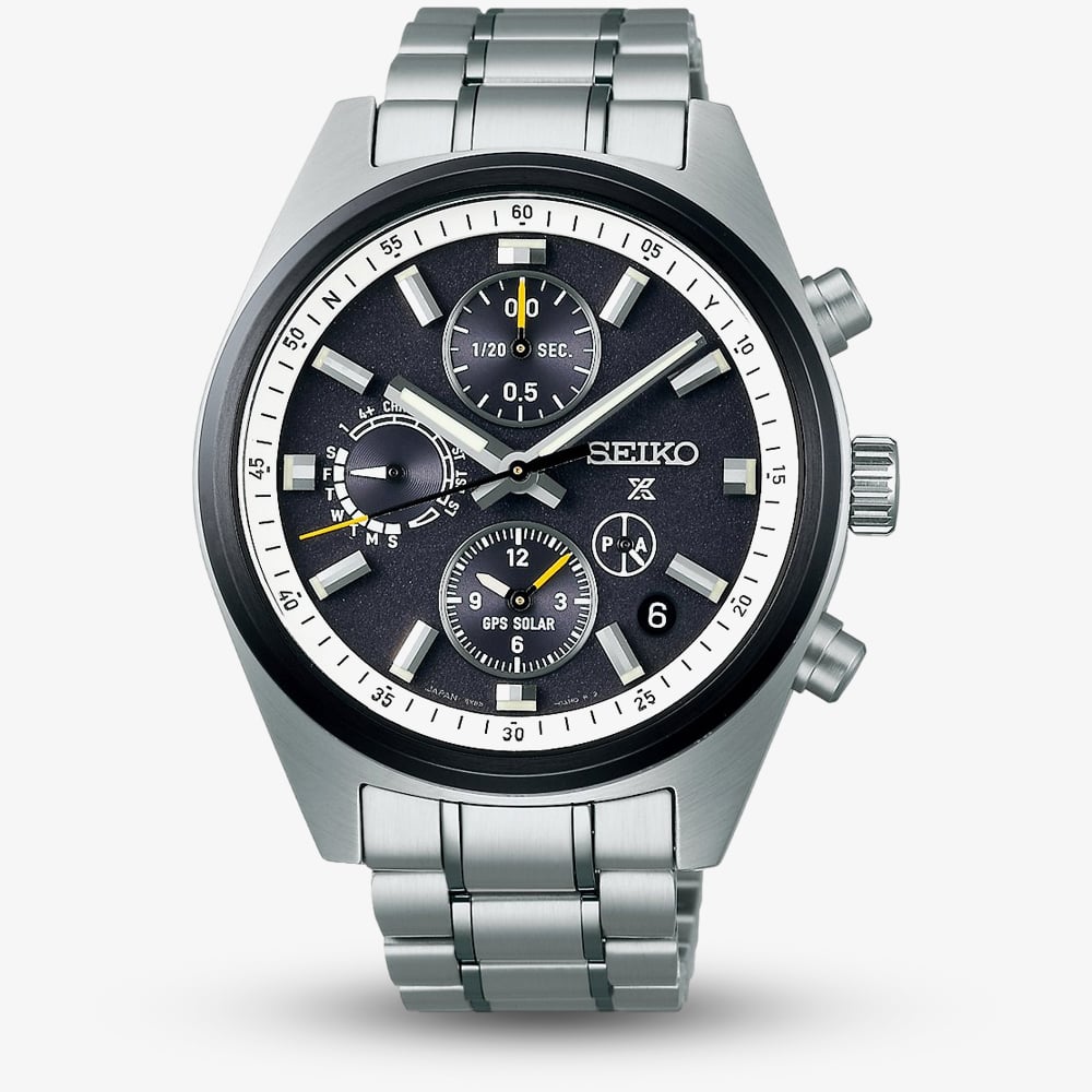 Introducing the first GPS Solar Chronograph in the Prospex collection, Seiko’s most advanced chronograph yet. Inspired by the 1972 “Panda” design, it combines classic styling with bold orange accents. Under dual-curved sapphire crystal, the black dial features dual-time display, high-speed time zone adjustment, and a time transfer function. A chronograph scale on the inner bezel and UTC markings enhance readability and precision. Powered by Seiko’s 5X83 Solar GPS calibre, it measures elapsed time to 1/20th of a second, offers ±15 seconds/month accuracy, and has a six-month power reserve. Rechargeable by any light source, it’s built for convenience. Prospex watches are crafted for durability, reliability, and performance, designed to meet the needs of adventurers and sports enthusiasts alike. · Powered by the solar powered movement with 14 jewels and a power reserve of up to 6 months. · Presented on a silver stainless steel bracelet . · Scratch resistant sapphire crystal glass. · 42mm case width. · 100 metre water resistance.