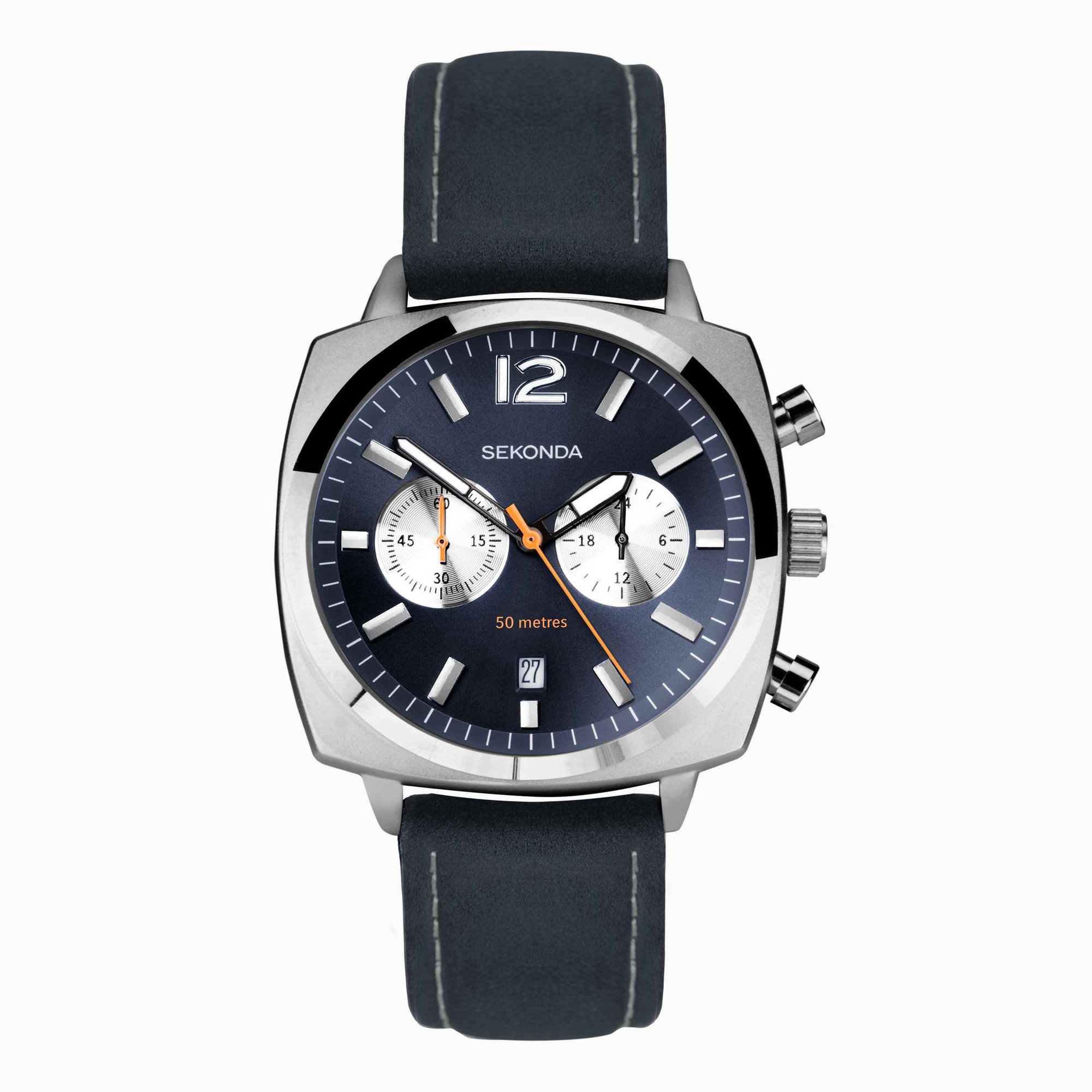 This watch has a cushion shaped, silver ion-plated alloy case with a blue dial. Fastened with an interchangeable blue leather strap, features include 1 second chronograph timing up to 1 hour, a date display and up to 50 metres water resistance.