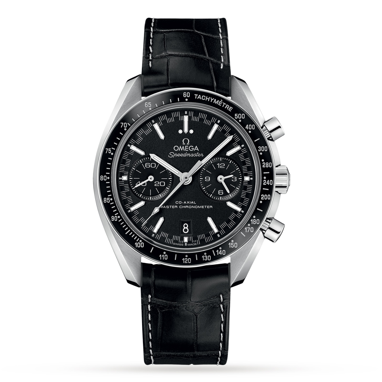 Speedmaster heritage with a distinctive racing style minute-track Powered by the 9900 calibre movement 44. 25mm stainless steel case with black ceramic bezel and black leather strap Master Chronometer officially certified by METASWater resistant to 10 bar (100 metres) ICONIC RACING STYLE The iconic Speedmaster Racing collection blurs the lines between technical excellence and elegance. Originally designed for the track, this collection celebrates Omega’s motor racing heritage, with its distinctive minute track, sporty strap and refined details. It’s no surprise that this collection has become truly legendary. OPTIMUM PRECISION This 44. 25mm model features a stainless steel case, paired with a black leather strap and a black ceramic bezel ring with the famous tachymeter scale in Liquidmetalâ„¢. On the black dial there is a distinctive racing style minute-track, two sub-dials with rhodium-plated applied rings, and a date window at 6 o’clock. Providing unrivalled precision, the 9900 calibre movement has been officially certified by the prestigious Swiss Federal Institute of Metrology (METAS) and is water resistant to 10 bar (100 metres).