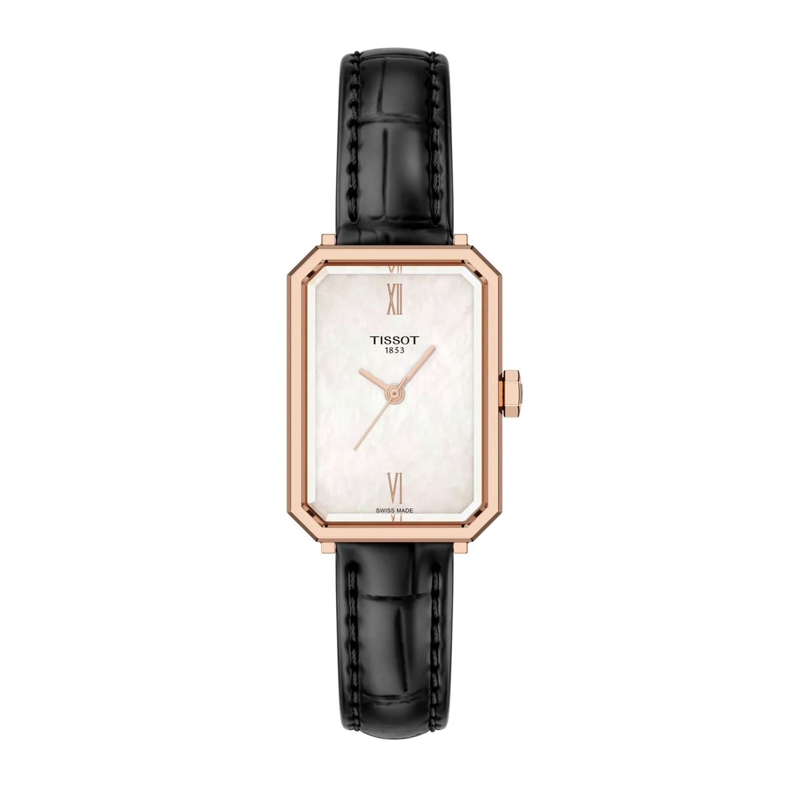 The SRV watch is inspired by Art Deco, a distinctive style which flourished in the 1920s. Characterised by geometric shapes and abstract patterns, it became a dominant style in architecture, interior design, fashion and graphic arts. While the SRV is directly inspired from a model from 1975, that very design was itself a reinterpretation of Tissot’s earlier creations from the 1920s. SRV stands for Sapphire Rectangle V, the perfect name for a faceted sapphire glass with a rectangular silhouette, and a 5-bar water resistance, symbolised by the roman number 5. Its quartz movement delivers reliable precision while the End-Of-Life indicator lets you know when it’s time for a battery change. The leather strap stands out by its evolution over time. It adapts to your wrist, offering comfort and a unique fit. This rectangular watch with a mother-of-pearl dial will elevate your look and offer you confidence and comfort.