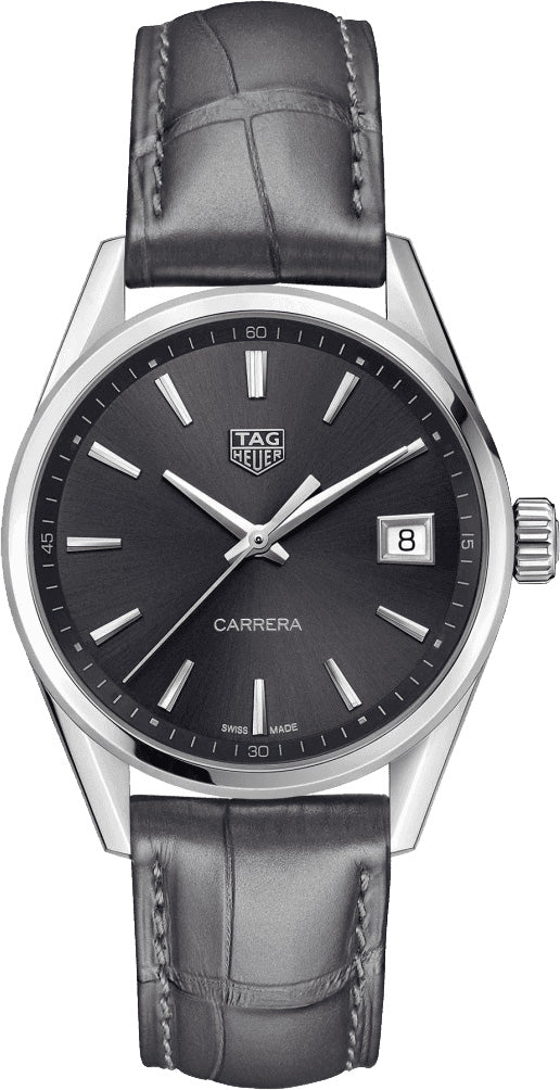 TAG Heuer Watch Carrera Ladies WBK1313.FC8260 This breathtaking TAG Heuer Carrera Ladies watch perfectly balances the line between sporty and sophisticated with a hint of femininity that can only be matched by the elegance of its wearer. It’s mesmerising combination of luxury materials like alligator leather and stainless steel make it unmissable on the wrist while the high performing Swiss quartz movement reminds us that appearance is only the beginning. Renowned for their highly accurate and powerful movements, TAG Heuer refuse to neglect their range of women’s watches and have equipped this TAG Heuer Carrera watch with one of their famous Swiss made quartz calibres. The battery operated movement brings to life the hour, minute and seconds function and a date window at 3 o clock on a striking anthracite grey dial decorated with faceted indices and sleek steel hands. Housed above the dial is high quality sapphire crystal glass treated with an anti-reflective coating known for its scratch resistance and crisp legibility alongside a neatly sized 36mm polished stainless steel case and fine-brushed and polished decoration stamped case back. For one final touch of sophistication, this TAG Heuer Carrera watch for women is fitted with a luxurious grey satin alligator leather strap and a classic stainless steel folding buckle.
