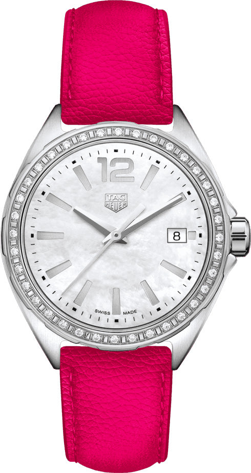 TAG Heuer Watch Formula 1 Ladies. WBJ131A.FC8252 The perfect ladies watch for today’s powerful women, this TAG Heuer Formula 1 beautifully combines both a sporty and elegant aesthetic with an unbeatable Swiss quartz movement. Described by TAG Heuer as the perfect marriage of fashion and functionality, this stunning TAG Heuer ladies watch makes use of precious materials like diamond and mother of pearl to create an unmissable finish on the wrist while also housing a quartz calibre considered one of the most reliable and accurate made in Switzerland. Instantly noticeable, the striking white mother of pearl dial of this TAG Heuer Formula 1 Ladies watch is decorated with the brand’s famous logo at 12 o clock, rhodium plated indexes and sleek faceted steel hands. The neatly sized 35mm fine brushed and polished stainless steel case is decorated with 36 dazzling diamonds across the bezel and remains water resistant to 100 metres and moulds elegantly to the wrist thanks to the unmissable bright pink leather strap and stainless steel pin buckle. Hidden within is a Swiss made quartz movement which equips the timepiece with hour, minute and seconds function, a handy date window at 3 o clock and a special End-Of-Life battery indicator feature. This TAG Heuer Formula 1 watch for women is another fine example of the brand’s ability to embody glamour and functionality within a timepiece designed specifically for formidable ladies always on the move.