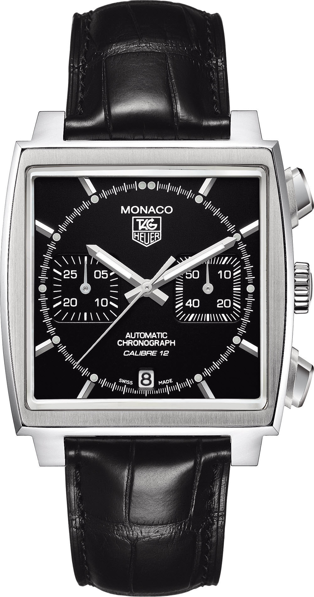 TAG Heuer Watch Monaco Chronograph. This automatic chronograph has the appealing square case design of a classic Monaco, with more power under the hood, a Calibre 12 chronograph. Two square counters at 3 and 9 o clock measure small seconds and chrono minutes. A sapphire crystal caseback reveals the Calibre 12 movement in action.