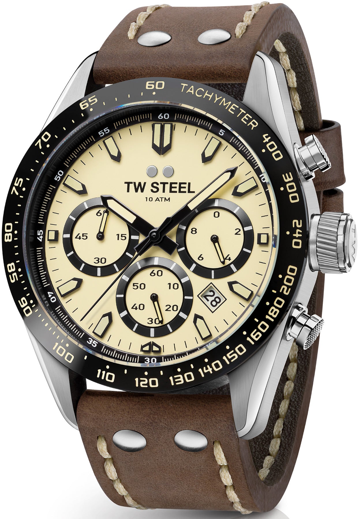TW Steel Watch Chrono Sport CHS2. TW Steel watches Sportive, stylish with a retro twist. This CHS2 features a 46mm steel case with a PVD black coated bezel, a matt cream dial, 10ATM and a dark brown leather strap with a steel clasp
