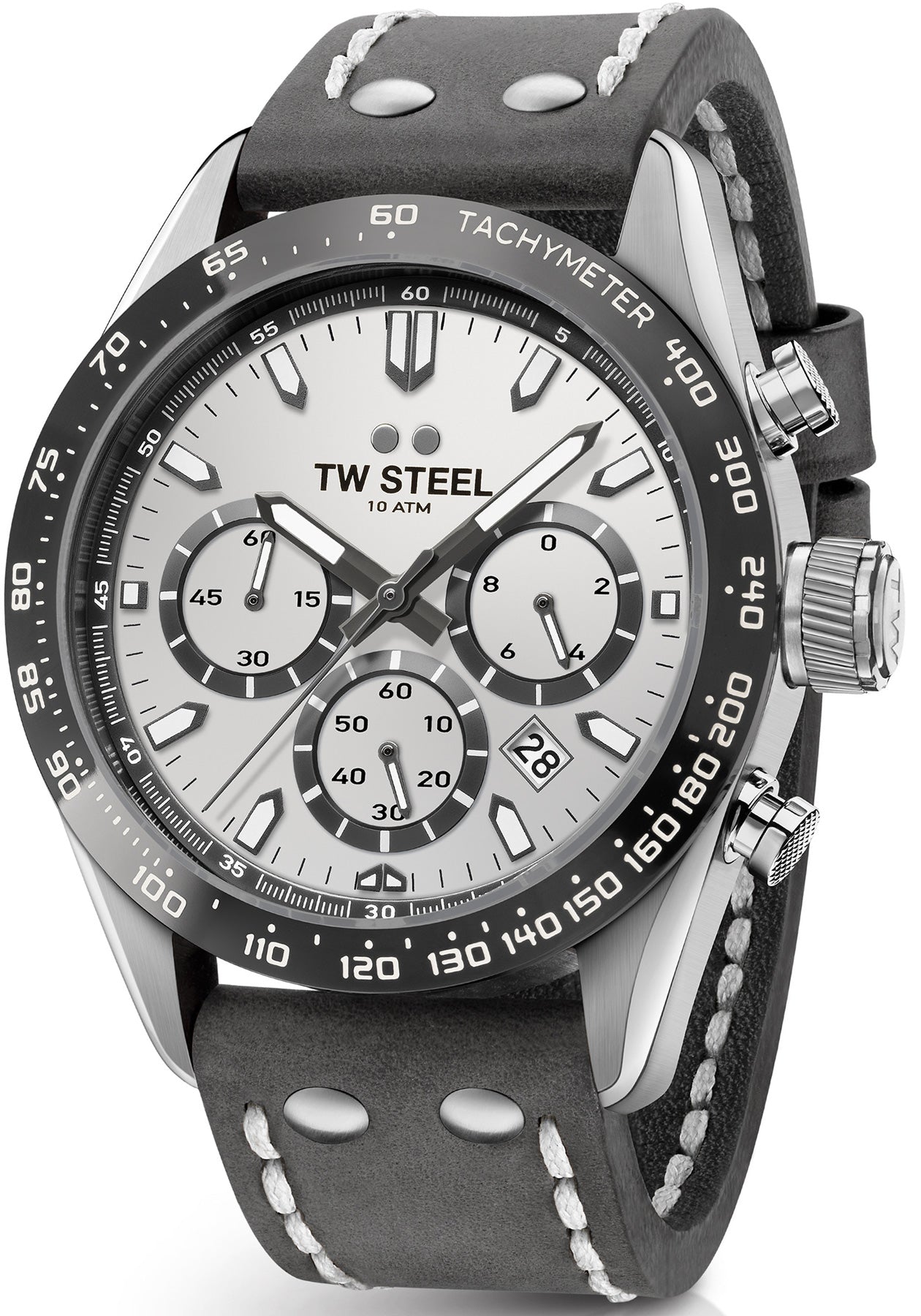 TW Steel Watch Chrono Sport CHS3. TW Steel watches Sportive, stylish with a retro twist. This CHS3 features a 46mm steel case with a PVD dark titanium coated bezel, a silver white dial, 10ATM and a dark grey leather strap with a steel clasp.